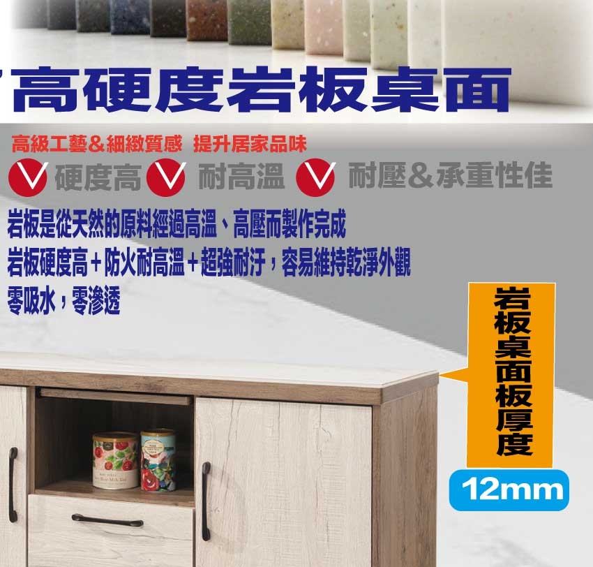 採用防蛀木心板+五金滑軌結構+烤漆五金腳座+12mm高硬度岩板桌面板等安心材質製造