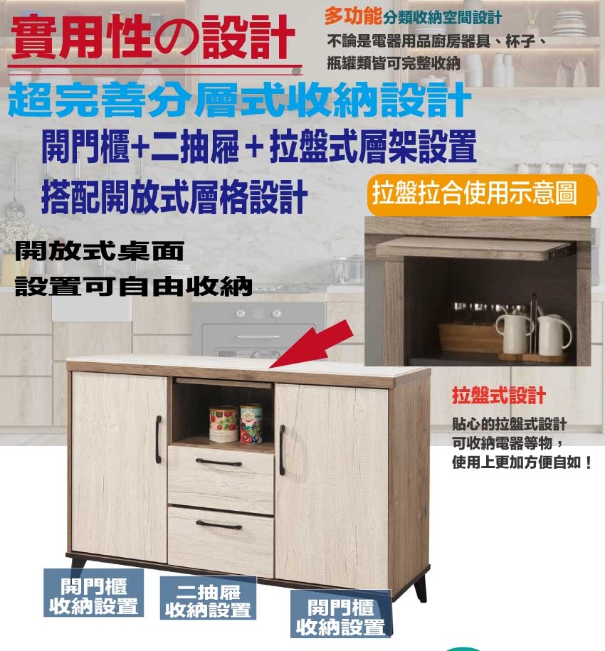 搭配採用開門櫃+二抽屜+開放層格+拉盤層架等收納空間設計
