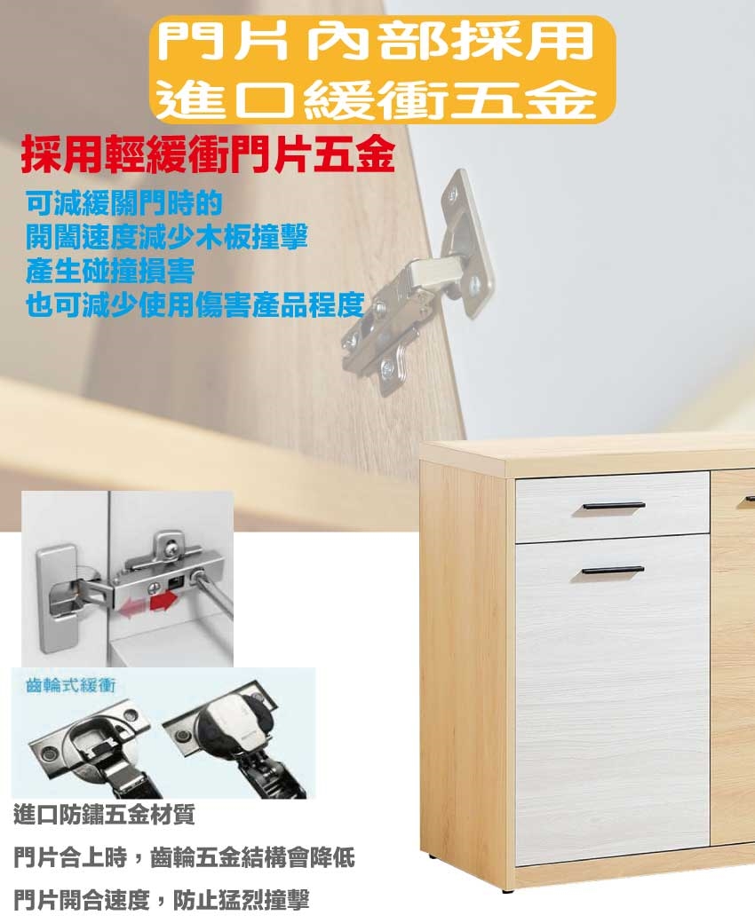 材質:防蛀木心板+五金滑軌結構+防刮耐磨腳座+防夾手緩衝門片五金
