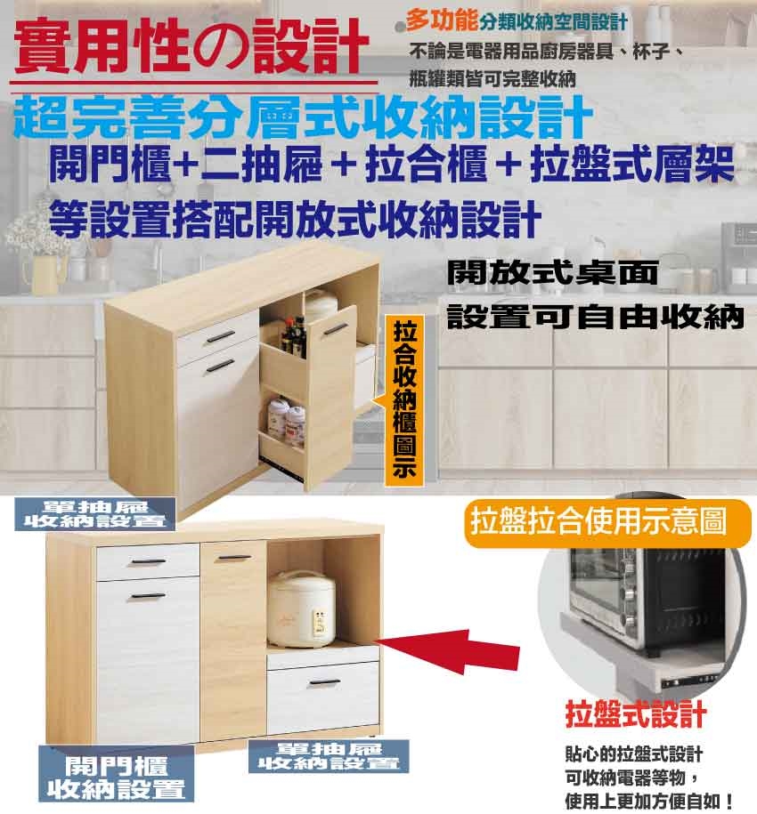搭配採用開門櫃+二抽屜+拉合收納櫃+內&外開放層格+拉盤層架等收納空間設計