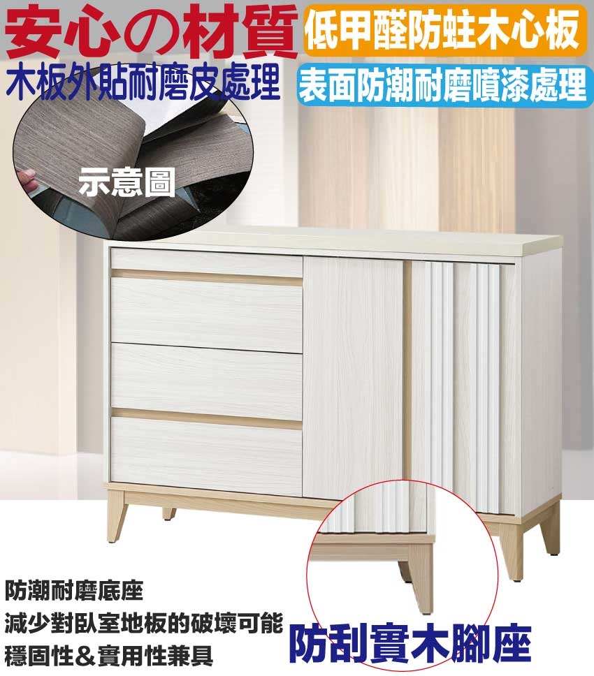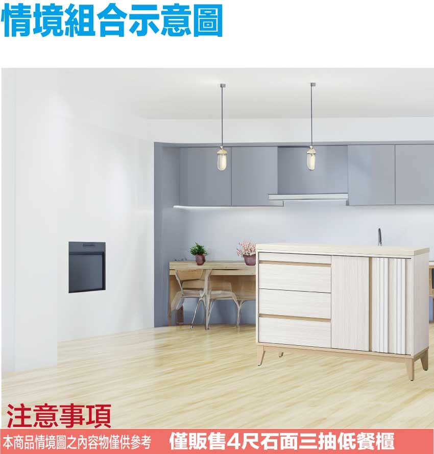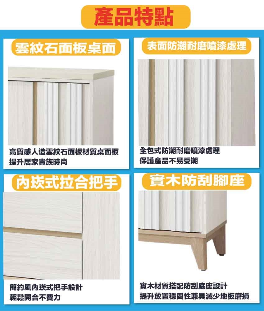 材質:防蛀木心板+防刮實木腳座(腳高12cm)+五金滑軌結構+4cm雲紋石面桌面板+防夾手緩衝門片五金