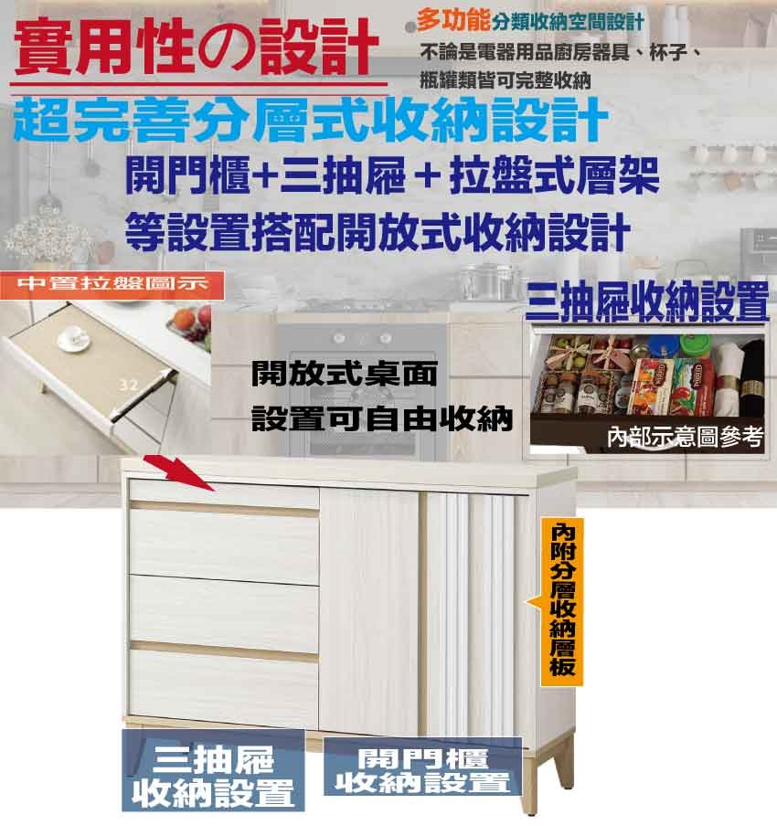 搭配採用開門櫃+中置拉盤收納+三抽屜+內開放層格等收納空間設計