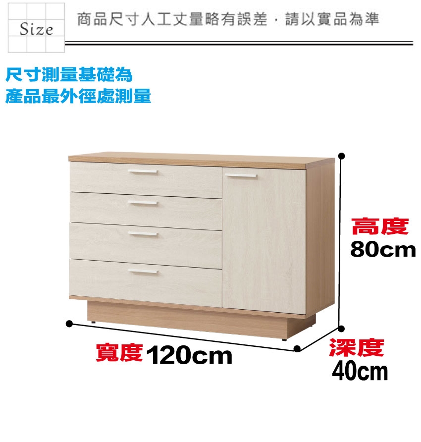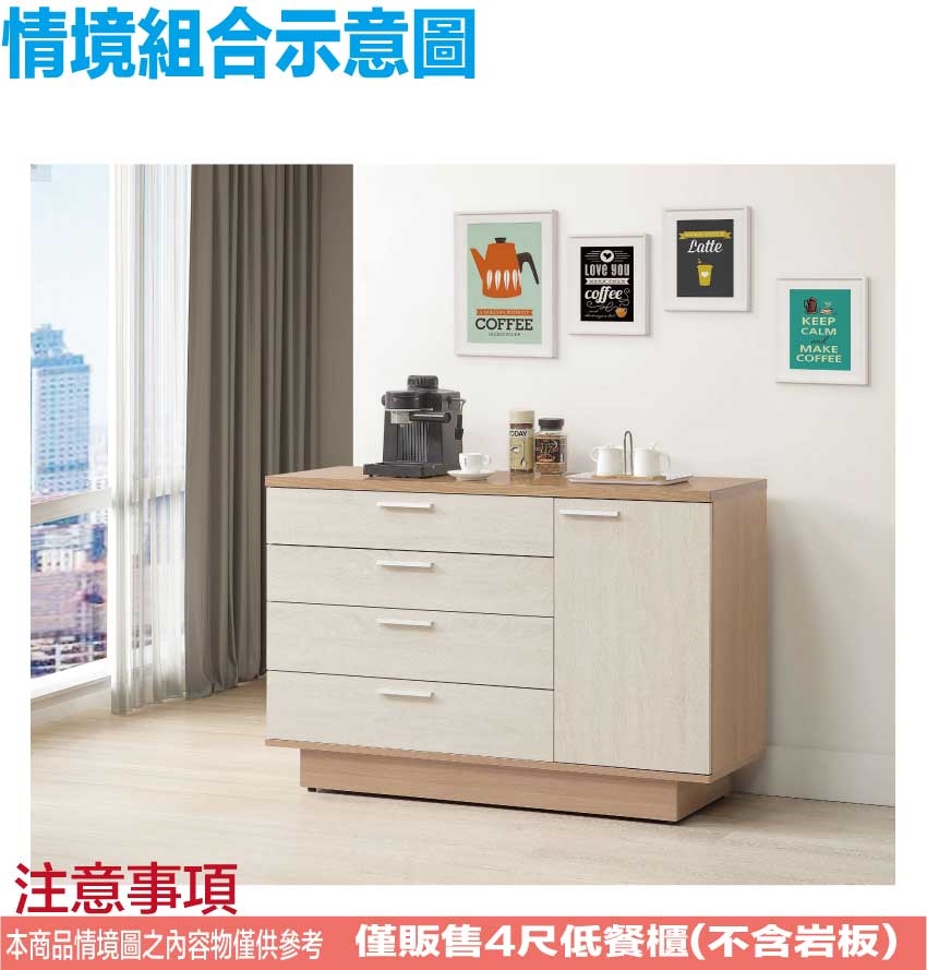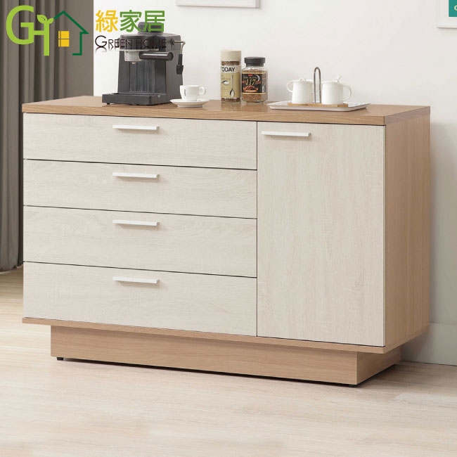 ★偏遠地區需額外加收運費,下標請先問與答詢問★ ★下訂前注意 由於商品流動較快,下訂前請先詢問是否有貨在下訂喔~★ 【綠家居】賓利雙色4尺單門四抽餐櫃 木紋雙色系+安心材質製造,使用放心+搭配居家更便利,採用防蛀木心板+防刮耐磨底座+防夾手緩衝門片五金等安心材質製造 ,外層採用防潮耐磨噴漆處理搭配採用開門櫃+四抽屜+內收納層格等收納空間設計,全由專人配送到家,專業安心服務,替你省下更多時間!