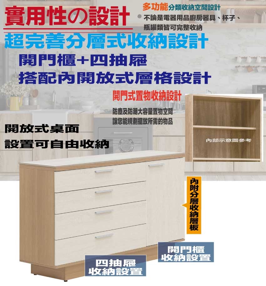 搭配採用開門櫃+四抽屜+內收納層格等收納空間設計