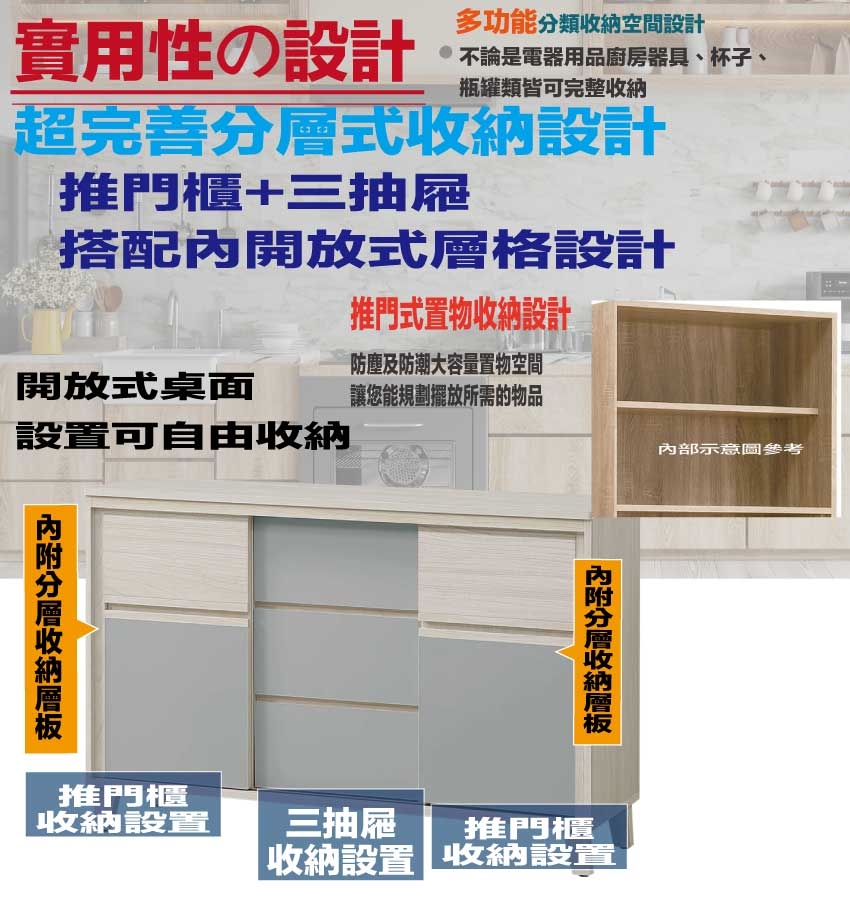 搭配採用推門櫃+三抽屜+內開放層格等收納空間設計