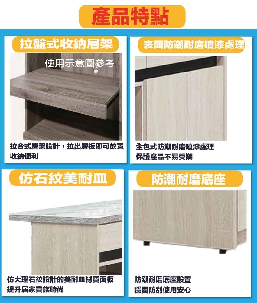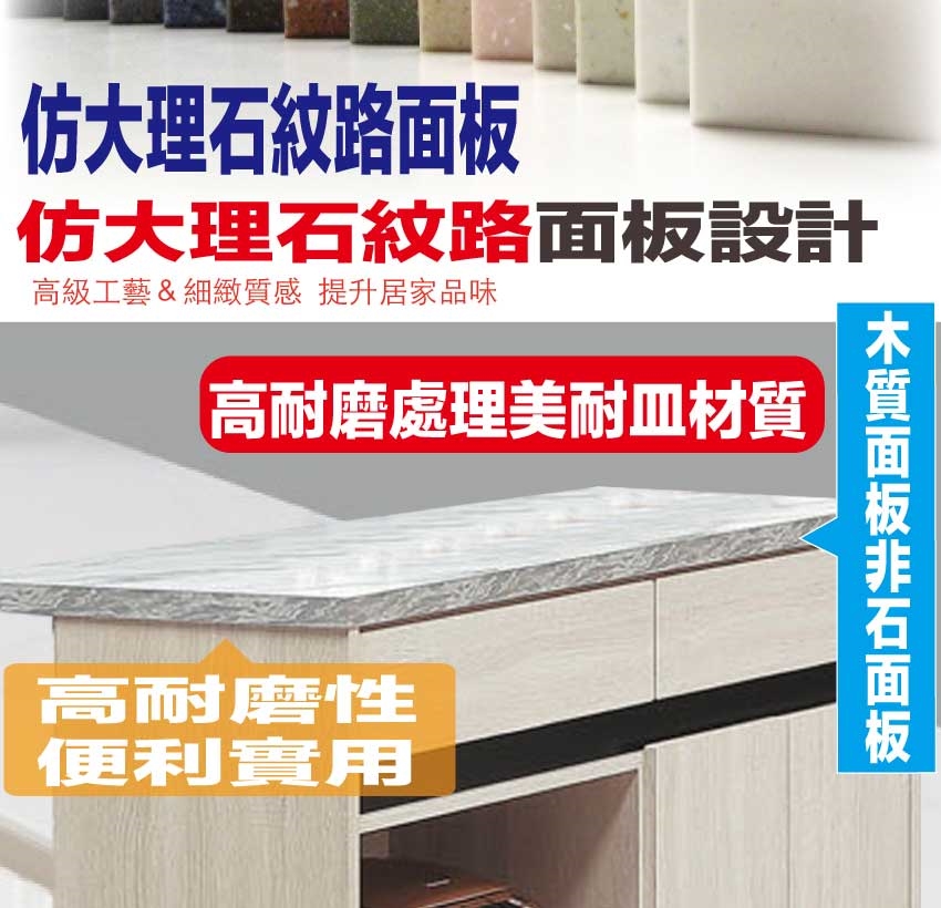 材質:防蛀木心板+防潮耐磨底座+防夾手緩衝五金+五金滑軌結構+耐磨美耐皿仿大理石紋桌面板