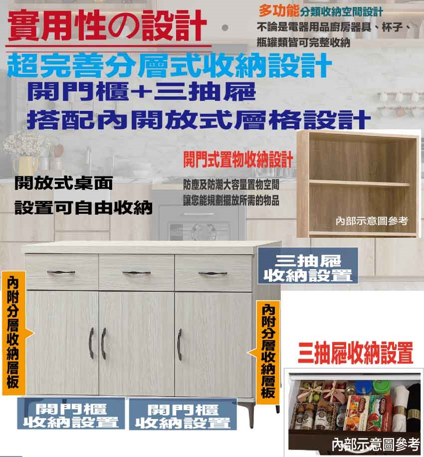 採用開門櫃+三抽屜+內開放層格等收納空間設計