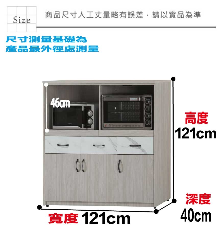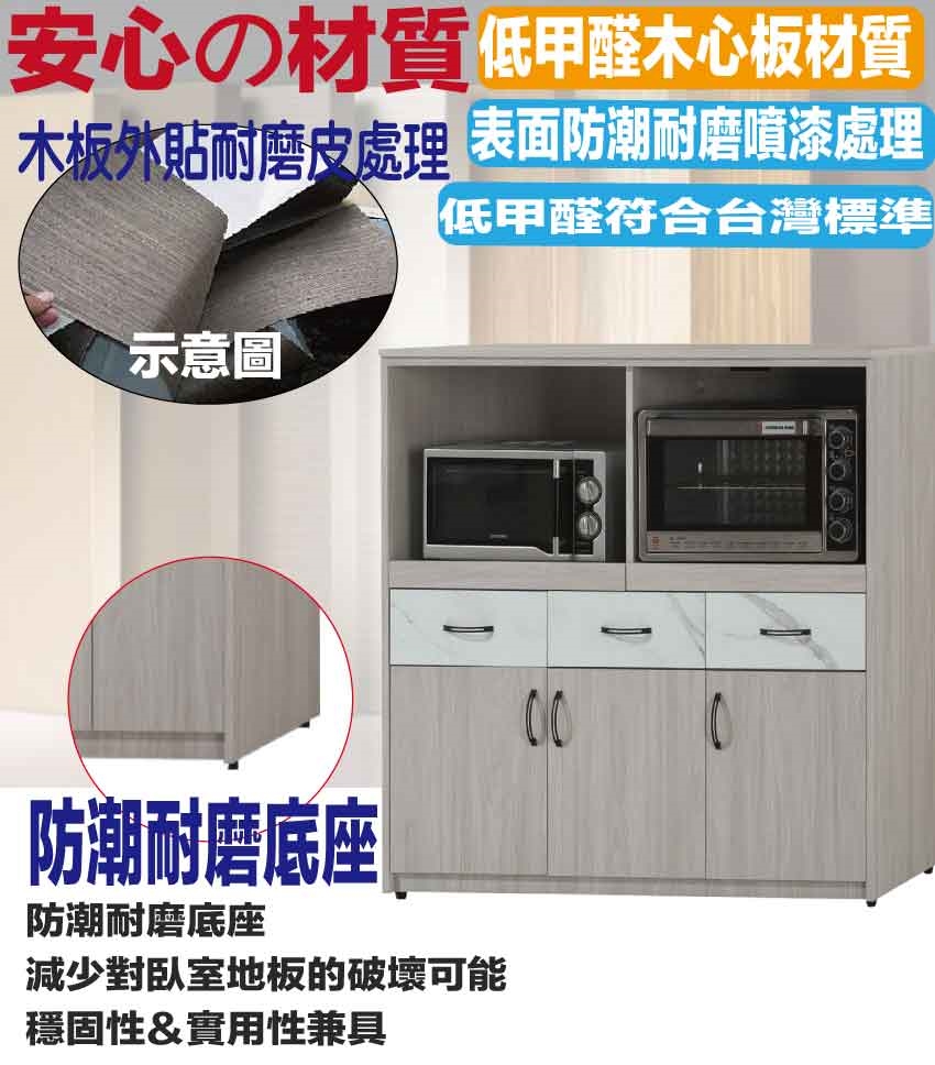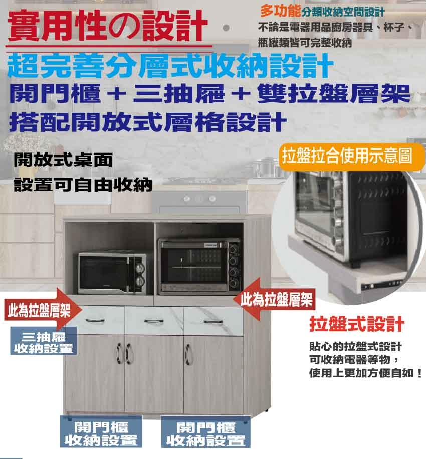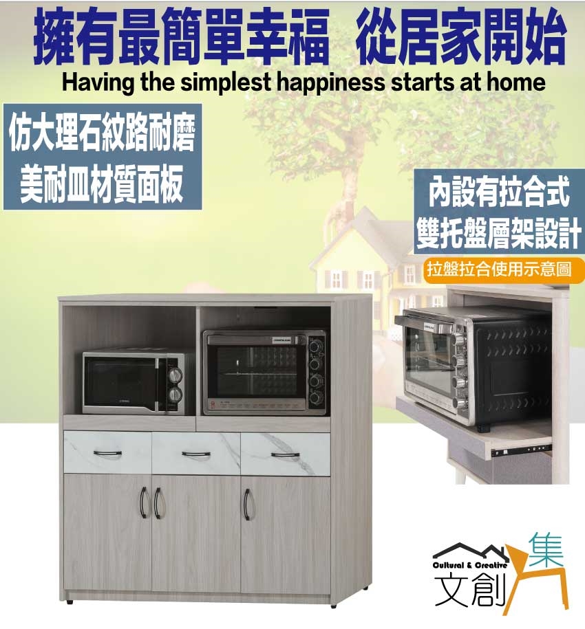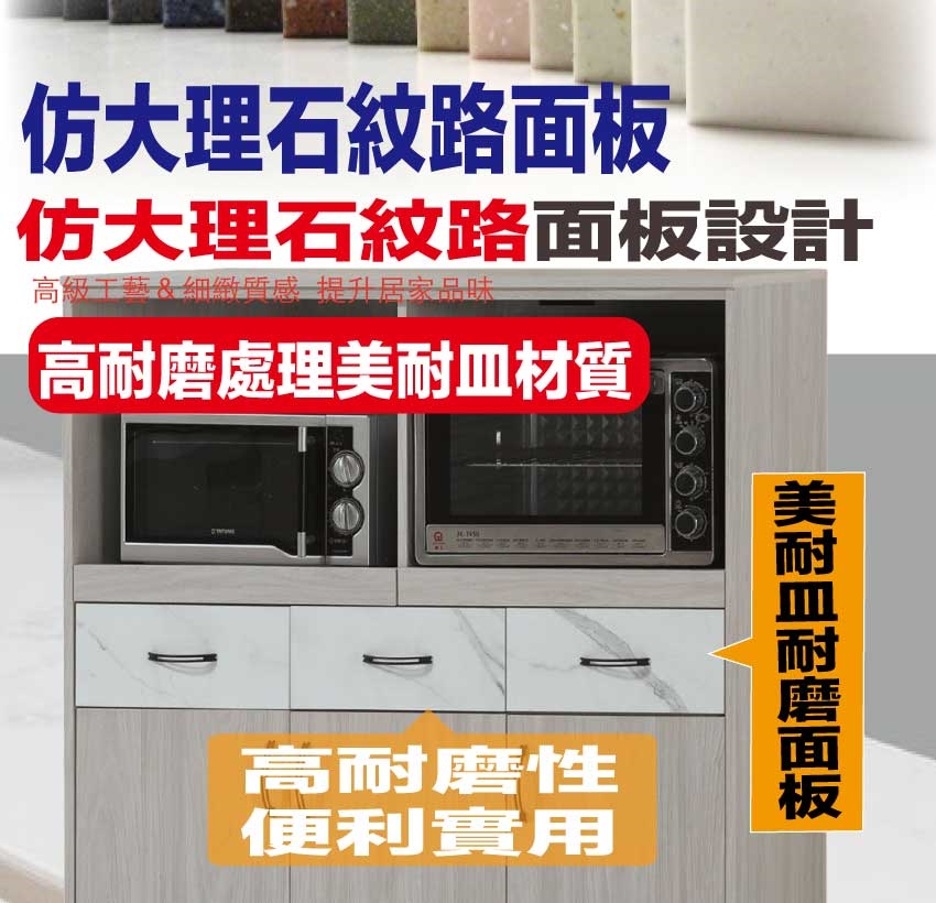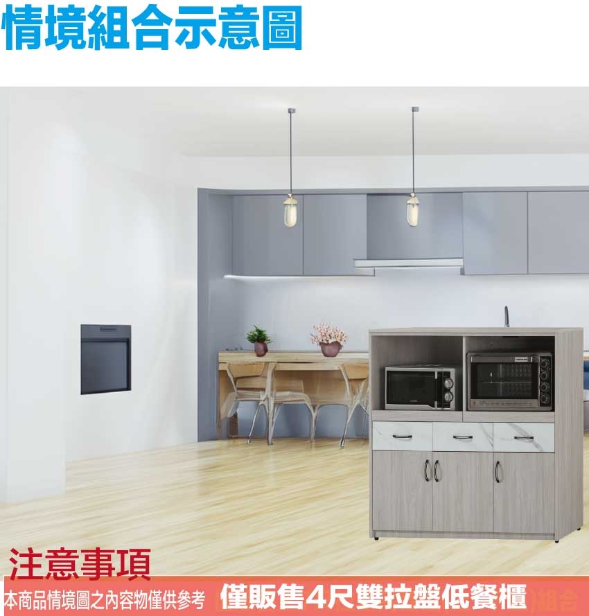 - ◆產品名稱:【綠家居】皮登4尺三門雙拉盤中低電器櫃/餐櫃(仿大理石紋路耐磨美耐皿面板)