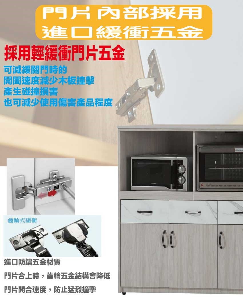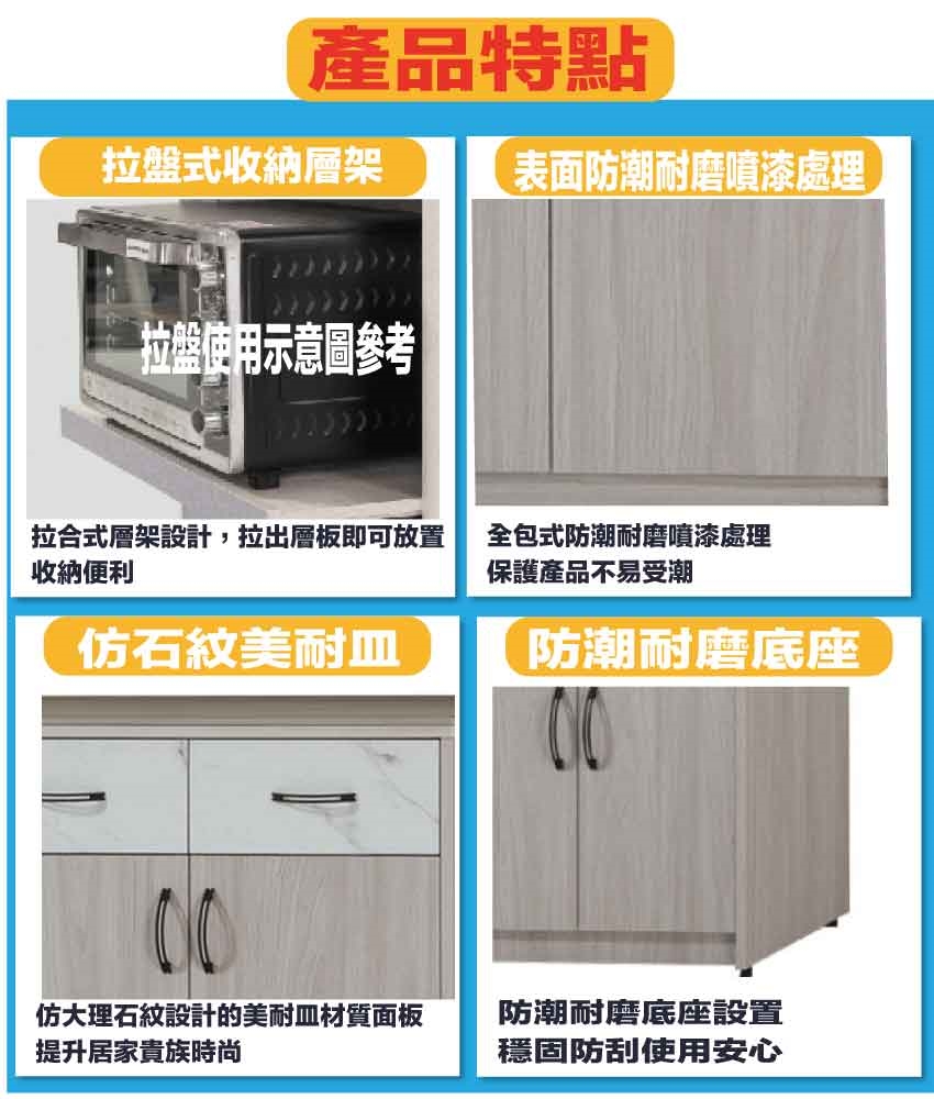 材質:防蛀木心板+防潮耐磨底座(可調高低水平)+仿大理石紋路耐磨美耐皿面板+防夾手緩衝門片五金