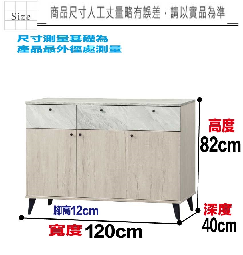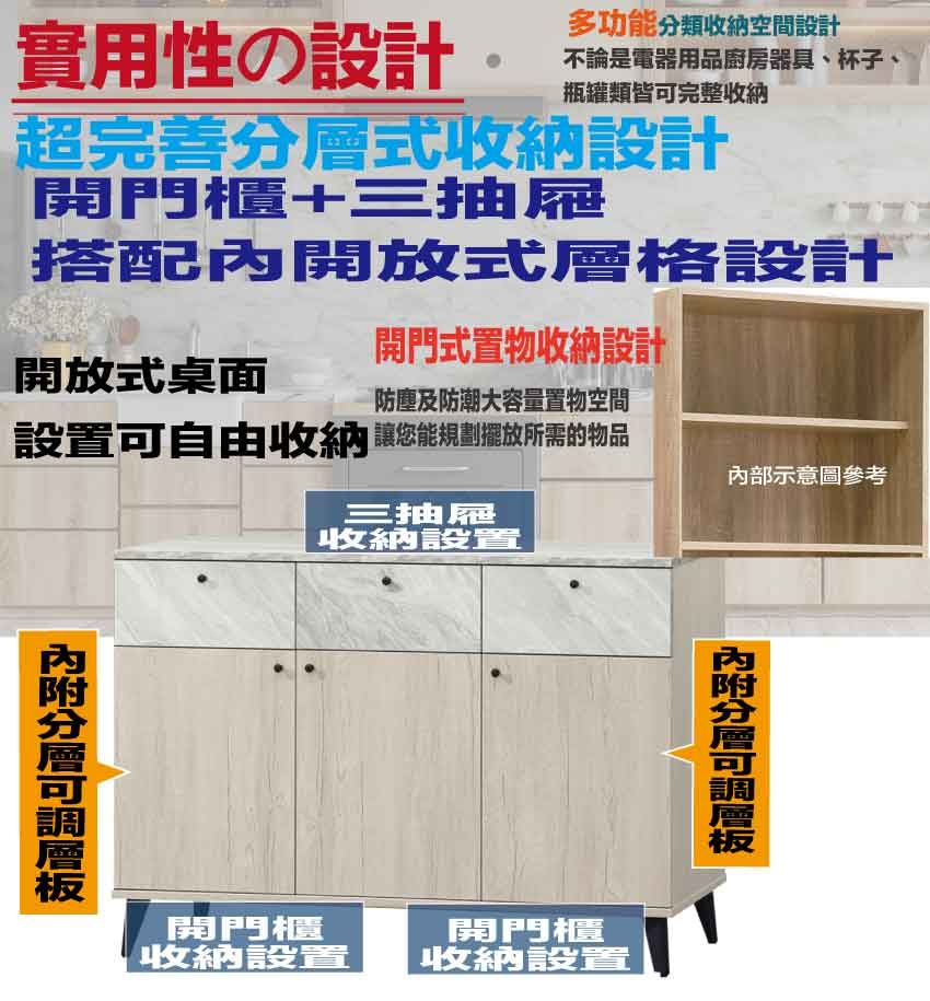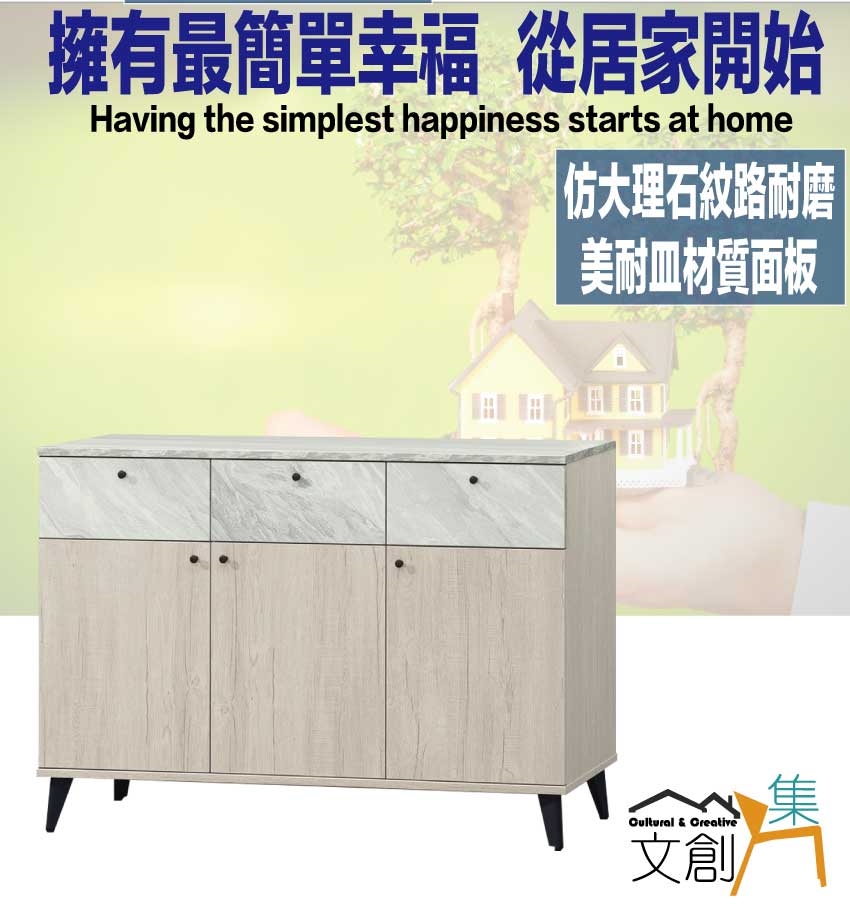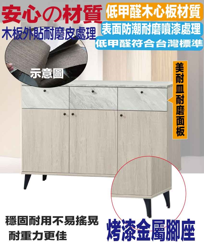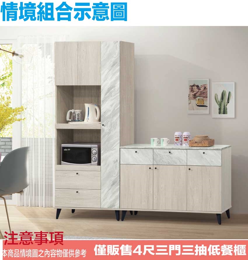 - ◆產品名稱:【綠家居】皮瑟4尺三門三抽低餐櫃(仿大理石紋路耐磨美耐皿面板)