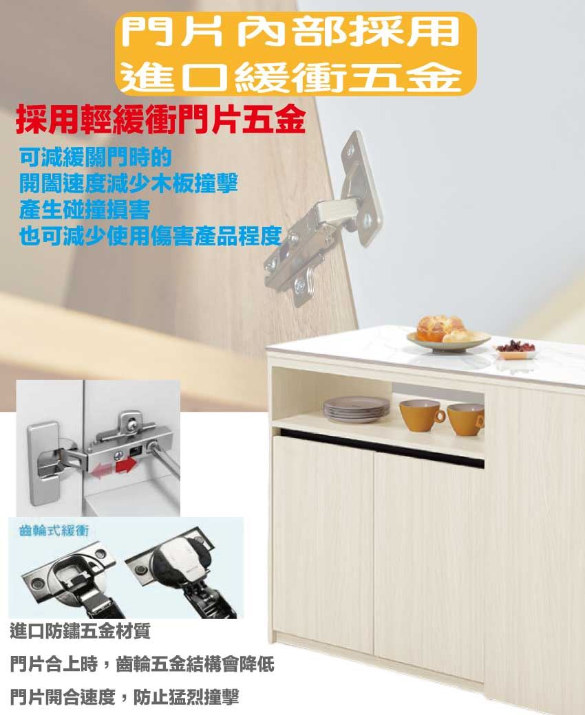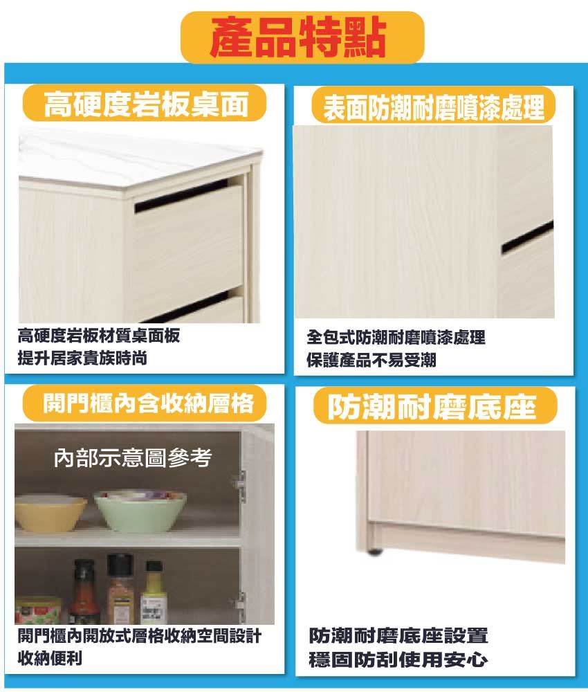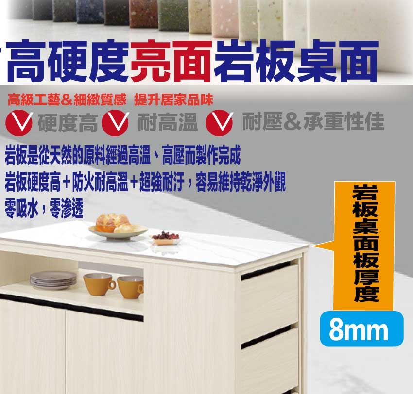 材質:防蛀木心板+防潮耐磨底座(可調高低水平)+防夾手緩衝門片五金+8mm高硬度岩板桌面板