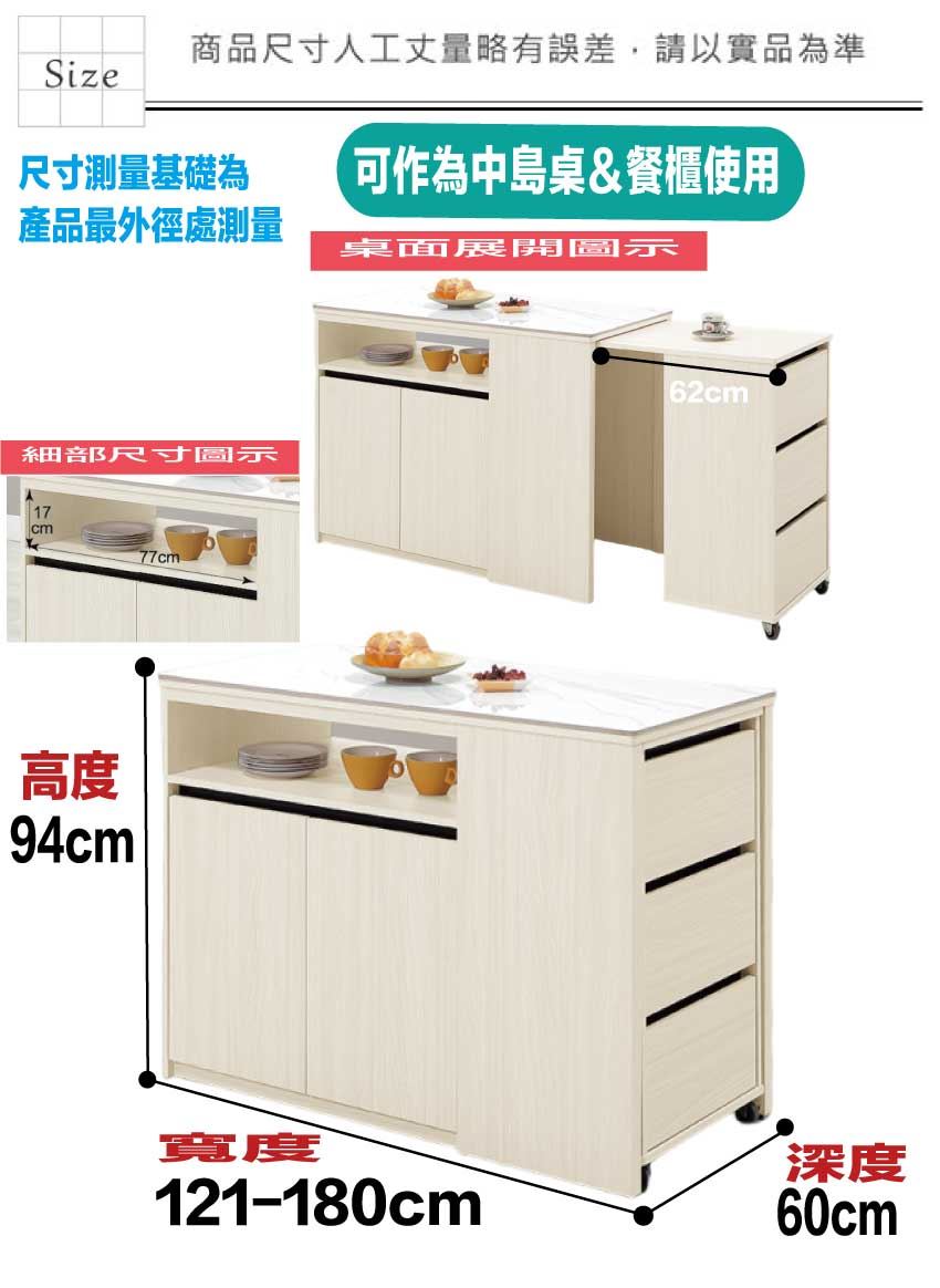 櫃身可拉合伸縮121-180cm寬&深度變化使用(側櫃底部為便利滑輪設置),桌面板可作為中島餐桌使用