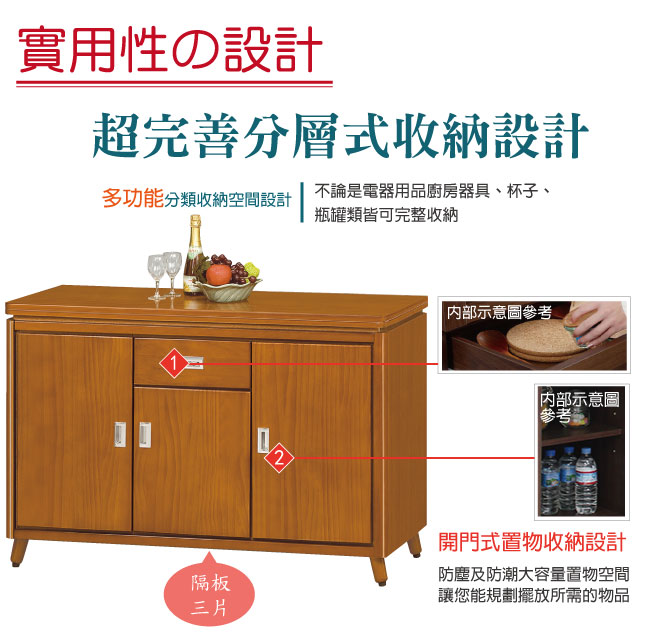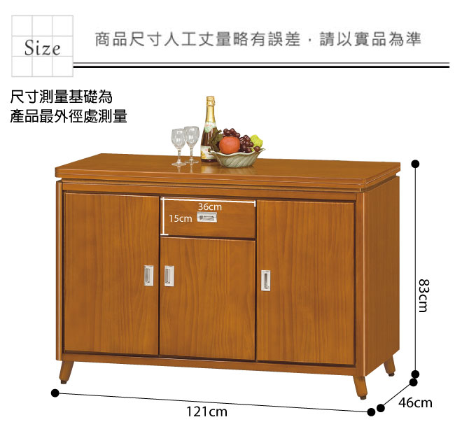 ◆產品名稱:【綠家居】希多 時尚4尺柚木紋餐櫃/收納櫃 餐櫃尺寸:(寬)121 x(深)46 x(高)83 /公分 ◆材質: 主體:松木實木+防蛀木心板 塗裝:優利坦抗磨三層全包式塗漆處理 軌道:鋼珠滑軌結構 五金:防夾手緩衝門片五金商品編號 | 尺寸 | 顏色 | 組裝方式 |