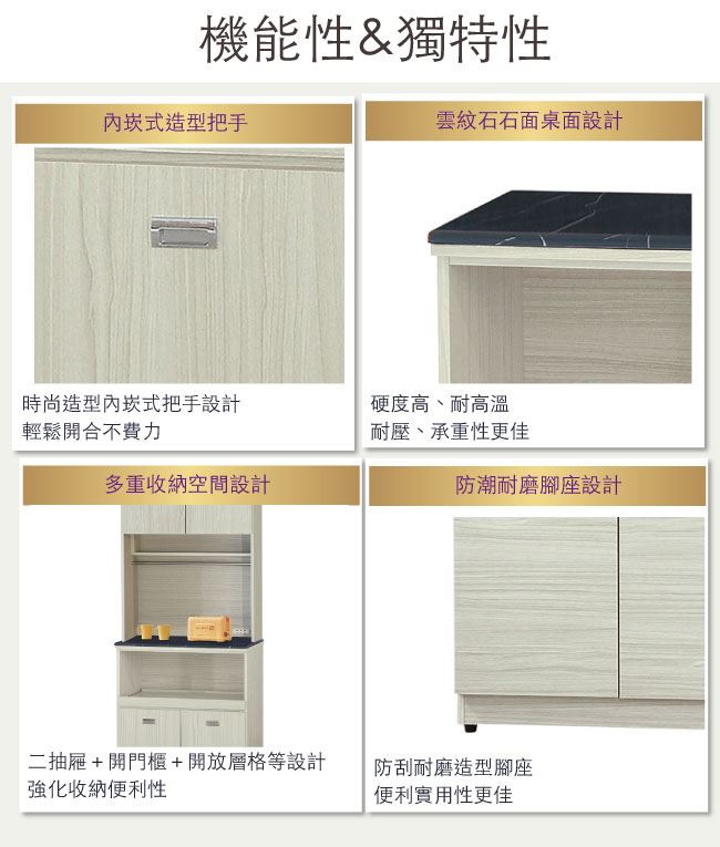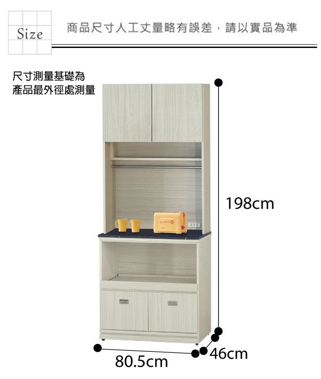 材質 | ◆產品名稱:【綠家居】曼谷 現代2.7尺雲紋石面餐櫃/收納櫃組合(上+下座) 收納櫃尺寸:(寬)80.5x(深)46x(高)198/公分 ◆材質: 材質:防蛀木心板+五金滑軌結構+1.2cm雲紋石面+耐磨防刮腳座 塗漆:優利坦全包式耐磨噴漆處理 |