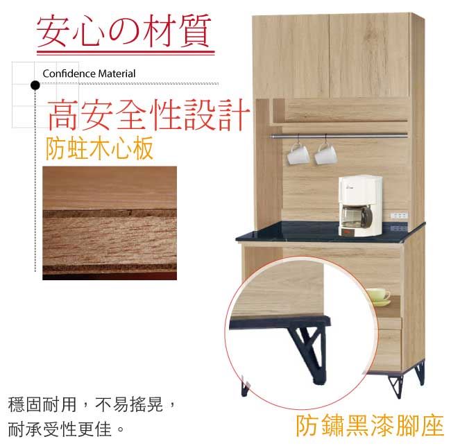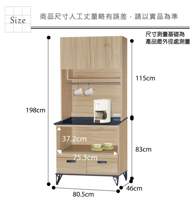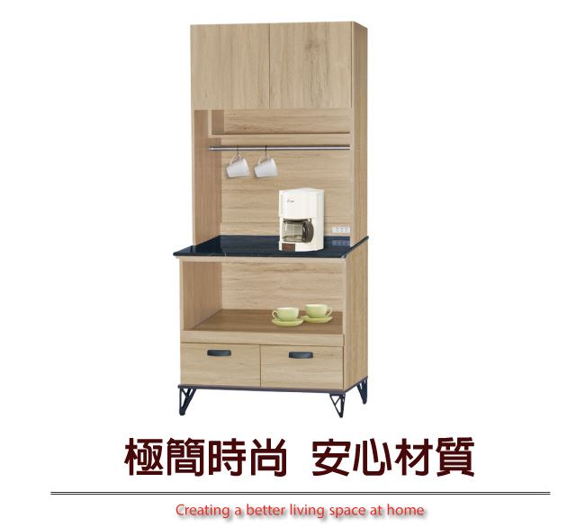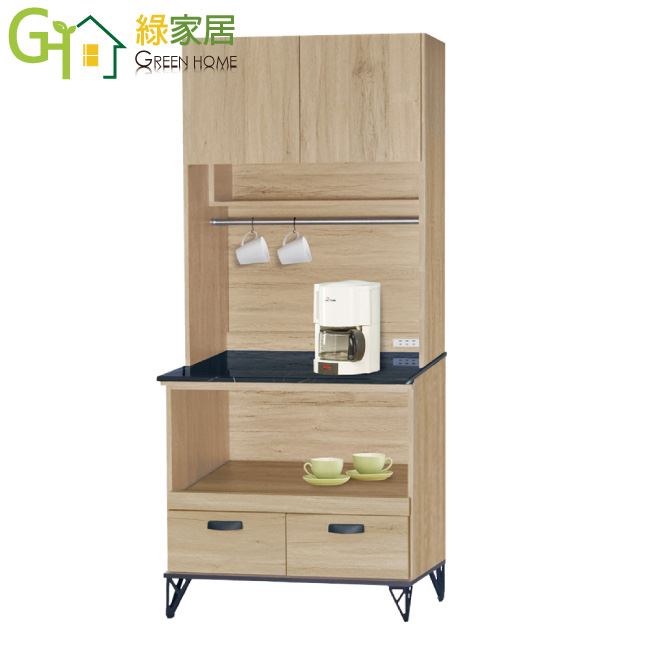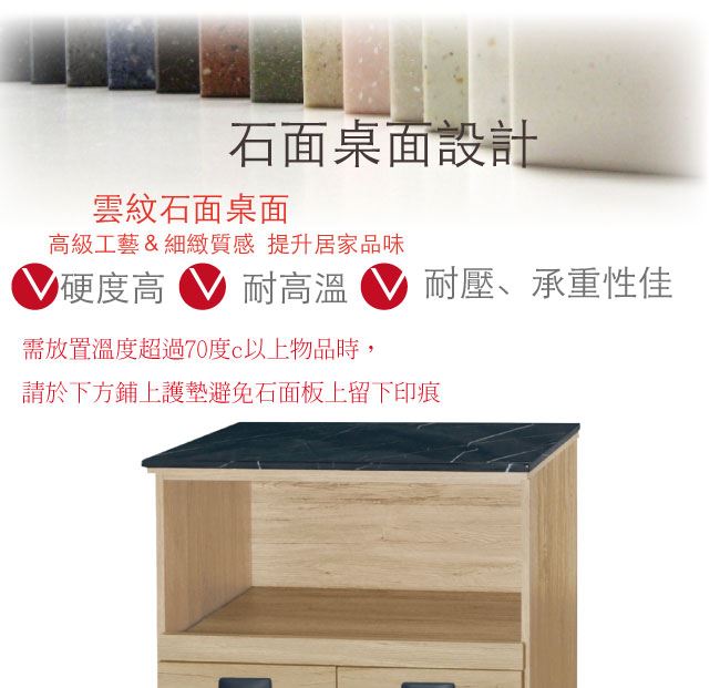 材質 | ◆產品名稱: 【綠家居】哈立爾 橡木紋2.7尺拉盤雲紋石面餐櫃組合 尺寸:(寬)80.5x(深)46x(高)198/公分 ◆材質: 材質:防蛀木心板+黑鐵砂腳座+五金滑軌結構+12mm雲紋石面板+防夾手緩衝門片五金 噴漆:防潮耐磨噴漆處理