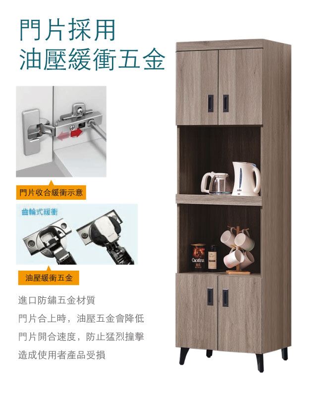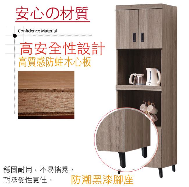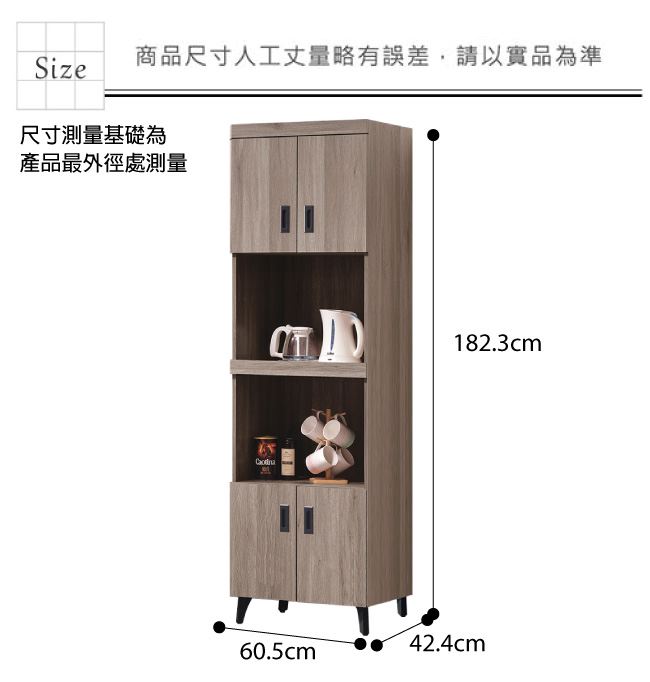 材質 | ◆產品名稱: 【綠家居】皮歐利 灰橡2尺四門高餐櫃/收納櫃 產品尺寸: 尺寸:(寬)60.5(深)42.4x(高)182.3/公分 ◆材質: 材質:防蛀木心板+防潮黑漆腳座+防夾手緩衝門片五金 塗漆:優利坦全包式耐磨噴漆處理