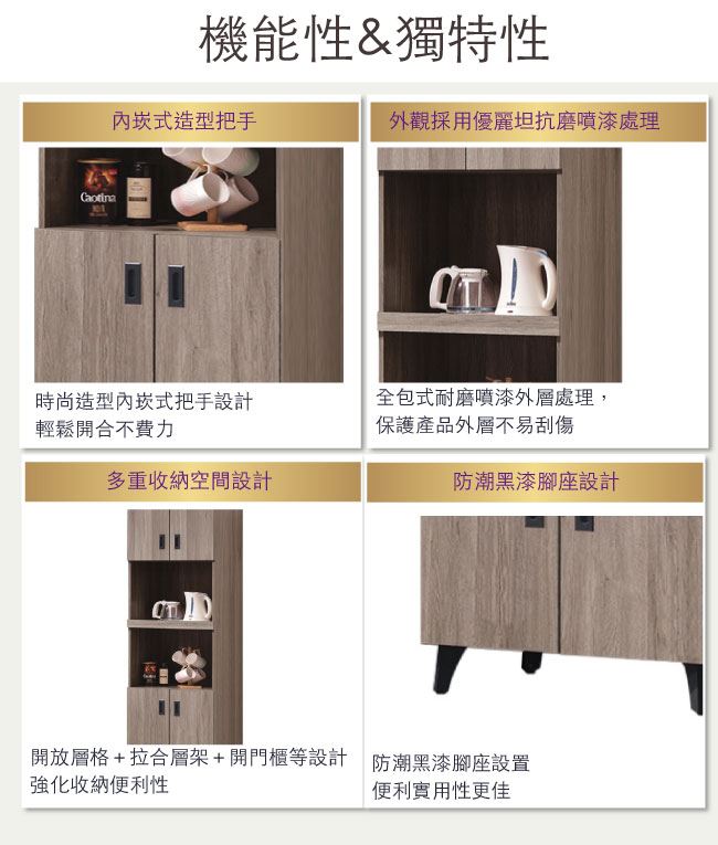 商品 介紹 | 【綠家居】皮歐利 灰橡2尺四門高餐櫃/收納櫃 灰橡木紋色系+現代簡約風格+安心材質製造,整體採用防蛀木心板+防潮黑漆腳座+防夾手緩衝門片五金等安心材質製造,外層採用優利坦全包式耐磨噴漆處理搭配採用開門櫃+開放式收納+拉合式層架等便利設計,全由專人配送到家,專業安心服務,替你省下更多時間! 【商品特色】 灰橡木紋色系+現代簡約風格+安心材質製造,使用放心+搭配居家更便利 採用防蛀木心板+防潮黑漆腳座+防夾手緩衝門片五金等安心材質製造 採用開門櫃+開放式收納+拉合式層架等便利設計 此商品不需要DIY組立,此商品為組立後之成品 品質保證、專業設計、貼心服務 全由專人配送到家,專業安心服務,替您省下更多時間 |