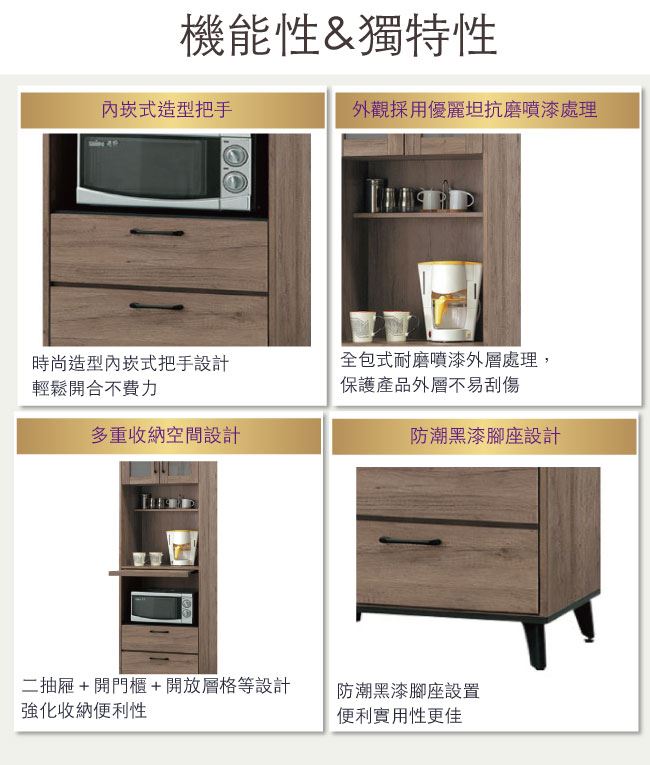商品 介紹 | 【綠家居】艾歐洛 現代2尺二門二抽高餐櫃/收納櫃 橡木紋色系+現代簡約風格+安心材質製造,整體採用防蛀木心板+五金滑軌結構+防潮黑漆腳座+防夾手緩衝門片五金等安心材質製造,外層採用優利坦全包式耐磨噴漆處理搭配採用開門櫃+開放式收納+二抽屜+拉合式層架等便利設計,全由專人配送到家,專業安心服務,替你省下更多時間! 【商品特色】 橡木紋色系+現代簡約風格+安心材質製造,使用放心+搭配居家更便利 採用防蛀木心板+五金滑軌結構+防潮黑漆腳座+防夾手緩衝門片五金等安心材質製造 採用開門櫃+開放式收納+二抽屜+拉合式層架等便利設計 此商品不需要DIY組立,此商品為組立後之成品 品質保證、專業設計、貼心服務 全由專人配送到家,專業安心服務,替您省下更多時間 |