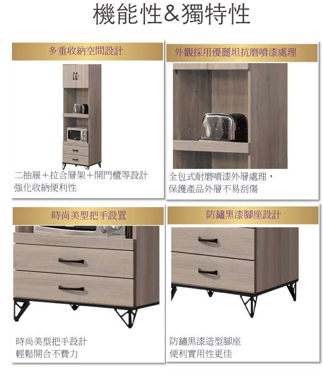 商品 介紹 | 【綠家居】菲希 灰橡2尺二門二抽高餐櫃 灰橡木紋色系+現代簡約風格+安心材質製造,整體採用防蛀木心板+五金滑軌結構+防鏽黑漆腳座+防夾手緩衝門片五金等安心材質製造,外層採用優利坦全包式耐磨噴漆處理搭配開門櫃+二抽屜+拉合式層架+開放式收納等收納設計,全由專人配送到家,專業安心服務,替你省下更多時間! 【商品特色】 灰橡木紋色系+現代簡約風格+安心材質製造,使用放心+搭配居家更便利 採用防蛀木心板+五金滑軌結構+防鏽黑漆腳座+防夾手緩衝門片五金等安心材質製造 開門櫃+二抽屜+拉合式層架+開放式收納等收納設計 此商品不需要DIY組立,此商品為組立後之成品 品質保證、專業設計、貼心服務 全由專人配送到家,專業安心服務,替您省下更多時間 |