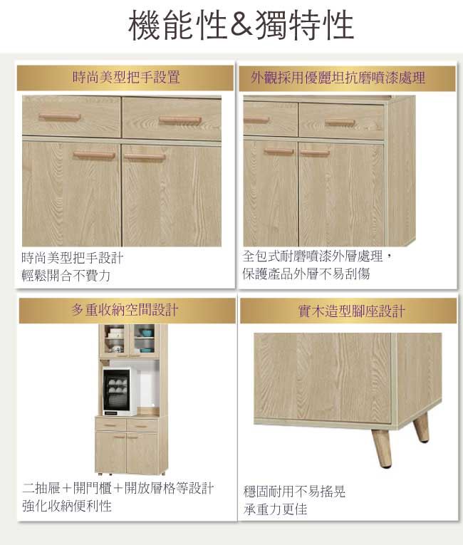 商品 介紹 | 【綠家居】范辛頓 時尚2.6尺四門二抽餐櫃/收納櫃組合 木紋雙色系+現代簡約風格+安心材質製造,整體採用防蛀木心板+防潮耐磨腳座+防夾手緩衝門片五金+五金滑軌結構等安心材質製造,產品外層採用防潮耐磨噴漆處理搭配採用開門櫃+二抽屜+開放式收納層格等收納空間設計,全由專人配送到家,專業安心服務,替你省下更多時間! 【商品特色】 木紋雙色系+現代簡約風格+安心材質製造,使用放心+搭配居家更便利 採用防蛀木心板+防潮耐磨腳座+防夾手緩衝門片五金+五金滑軌結構等安心材質製造 產品外層採用防潮耐磨噴漆處理 搭配採用開門櫃+二抽屜+開放式收納層格等收納空間設計 此商品不需要DIY組立,此商品為組立後之成品 品質保證、專業設計、貼心服務 全由專人配送到家,專業安心服務,替您省下更多時間 |