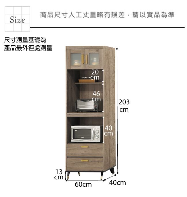 尺寸:(寬)60(深)40(高)203公分 ◆材質: 材質:防蛀木心板+防銹黑漆鍍烙腳座+防夾手緩衝門片五金+五金滑軌結構 噴漆:防潮耐磨噴漆處理