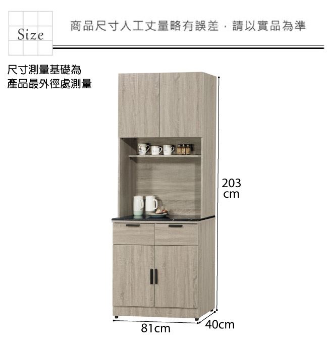 低餐櫃尺寸:(寬)81(深)40(高)203公分 ◆材質: 材質:防蛀木心板+防潮耐磨腳座+防夾手緩衝門片五金+五金滑軌結構+12mm雲紋石面桌面板 噴漆:防潮耐磨噴漆處理