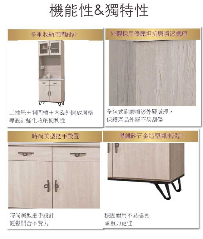 商品 介紹 | 【綠家居】曼塔2.7尺岩板高餐櫃/收納櫃組合 淺橡木紋色系+現代簡約風格+安心材質製造,整體採用防蛀木心板+黑鐵砂腳座+防夾手緩衝門片五金+五金滑軌結構+12mm高硬度岩板石桌面板等安心材質製造,產品外層採用防潮耐磨噴漆處理搭配採用開門櫃+二抽屜+內&外開放式層格等空間設計,全由專人配送到家,專業安心服務,替你省下更多時間! 【商品特色】 淺橡木紋色系+現代簡約風格+安心材質製造,使用放心+搭配居家更便利 採用防蛀木心板+黑鐵砂腳座+防夾手緩衝門片五金+五金滑軌結構+12mm高硬度岩板石桌面板等安心材質製造 產品外層採用防潮耐磨噴漆處理 搭配採用開門櫃+二抽屜+內&外開放式層格等空間設計 此商品不需要DIY組立,此商品為組立後之成品 全由專人配送到家,專業安心服務,替您省下更多時間 |