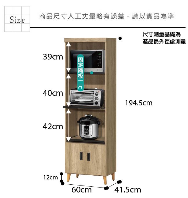 尺寸:(寬)60(深)41.5(高)194.5公分 ◆材質: 材質:防蛀木心板+防潮實木腳座+防夾手緩衝門片五金 噴漆:防潮耐磨噴漆處理