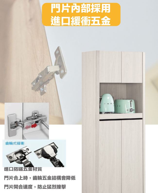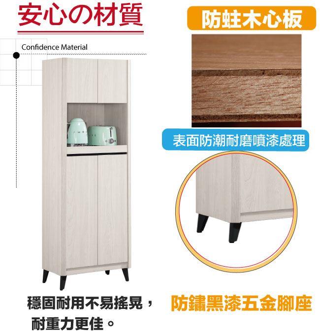 材質 | ◆產品名稱:【綠家居】卡蘿莉2尺三門多功能高餐櫃 餐櫃尺寸:(寬)60x(深)40(高)180公分 ◆材質:防蛀木心板+防鏽五金腳座+五金滑軌結構+防夾手緩衝門片五金 噴漆:防潮耐磨噴漆處理