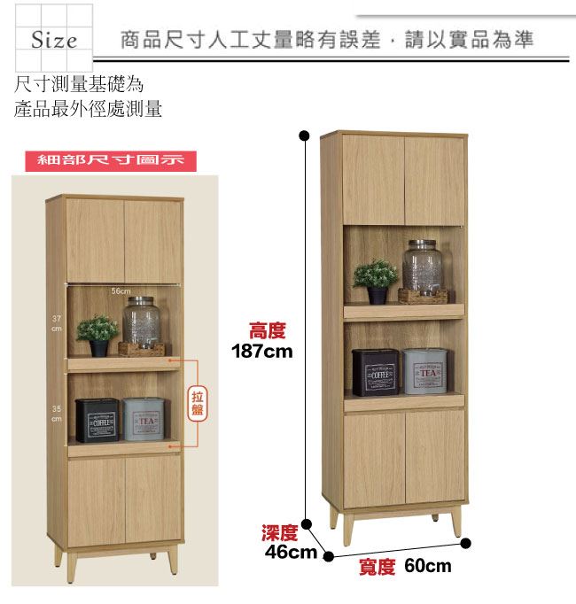 材質 | ◆產品名稱:【綠家居】神奈川2尺四門拉盤高餐櫃/收納櫃 尺寸:(寬)60x(深)46(高)187公分 ◆材質: 材質:防蛀木心板+防潮耐磨腳座(腳高16cm)+防夾手緩衝門片五金 噴漆:防潮耐磨噴漆處理