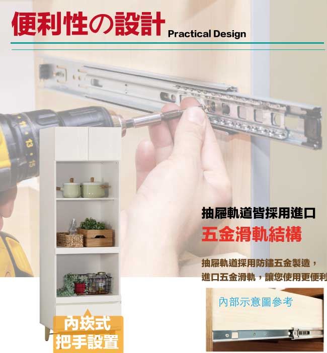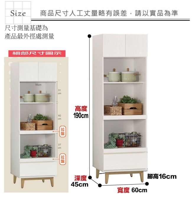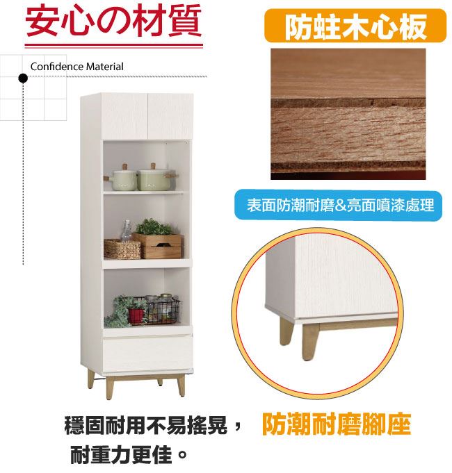 材質 | ◆產品名稱:【綠家居】奈吉亞雙色2尺二門單抽拉盤高餐櫃/收納櫃 尺寸:(寬)60x(深)45(高)190/公分 ◆材質: 材質:防蛀木心板+防潮耐磨腳座(腳座高16cm)+五金滑軌結構 噴漆:防潮耐磨&亮面噴漆處理