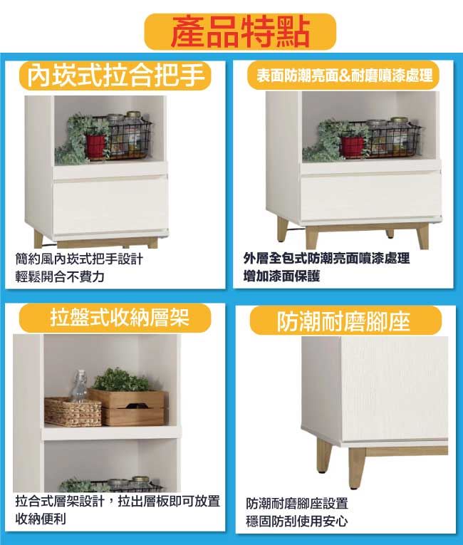 商品 介紹 | 【綠家居】奈吉亞雙色2尺二門單抽拉盤高餐櫃/收納櫃 木紋雙色系+現代簡約風格+安心材質製造,使用放心+搭配居家更便利,整體採用防蛀木心板+防潮耐磨腳座+五金滑軌結構等材質搭配外層採用優莉坦耐磨&亮面全包式噴漆處理 ,採用開門櫃+單抽屜+拉盤式層架+內&外開放層格等收納空間設計,全由專人配送到家,專業安心服務,替你省下更多時間! 【商品特色】 木紋雙色系+現代簡約風格+安心材質製造,使用放心+搭配居家更便利 防蛀木心板+防潮耐磨腳座+五金滑軌結構等材質 採用開門櫃+單抽屜+拉盤式層架+內&外開放層格等收納空間設計 此商品不需要DIY組立,此商品為組立後之成品 品質保證、專業設計、貼心服務 全由專人配送到家,專業安心服務,替您省下更多時間 |