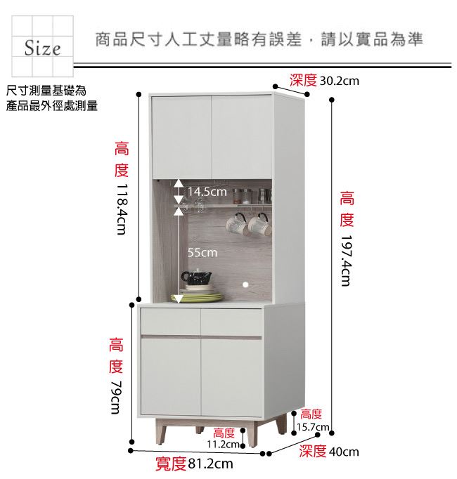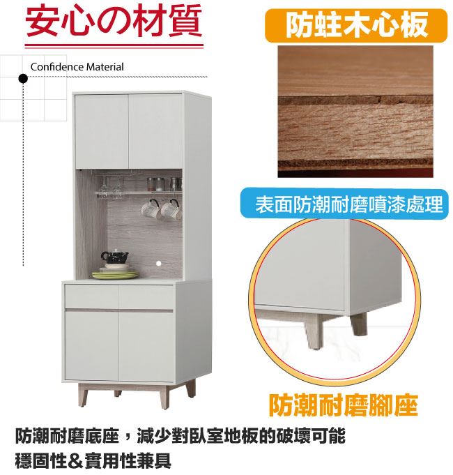 材質 | ◆產品名稱:【綠家居】卡地2.7尺四門二抽高餐櫃組合 尺寸:(寬)81.2x(深)40(高)197.4公分 ◆材質: 材質:防蛀木心板+防潮耐磨腳座+五金滑軌結構+防夾手緩衝門片五金 噴漆:防潮耐磨噴漆處理