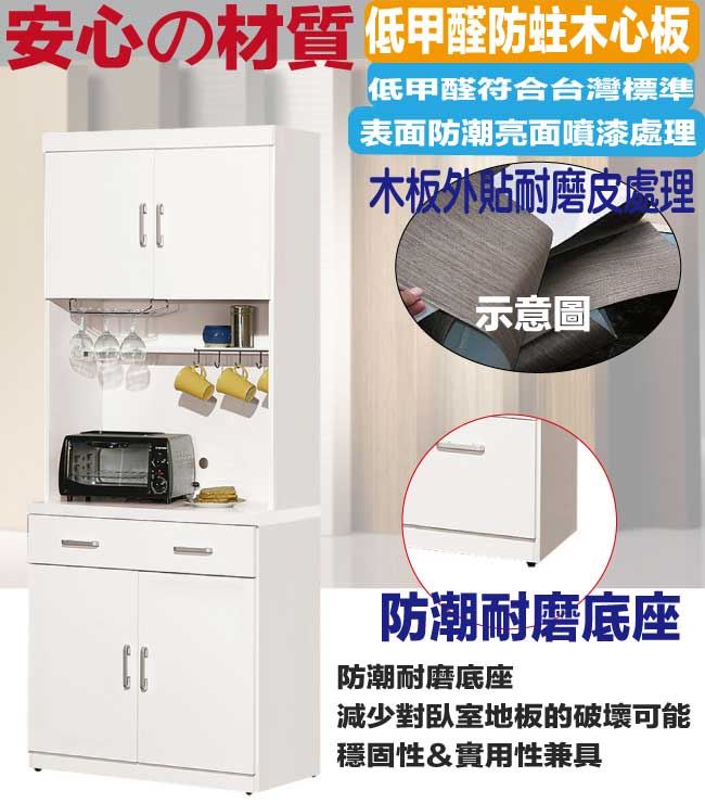 商 品 介 紹 | 【綠家居】巴克雅2.7尺四門二抽高餐櫃/收納櫃組合 簡約白色系+現代簡約風格+安心材質製造,整體採用防蛀木心板+防潮耐磨腳座+五金滑軌結構等安心材質製造,產品外層表面採用防潮亮面噴漆處理 搭配採用開門櫃+二抽屜+內&外層格等收納空間設計,全由專人配送到家,專業安心服務,替你省下更多時間! 【商品特色】 簡約白色系+現代簡約風格+安心材質製造,使用放心+搭配居家更便利 採用防蛀木心板+防潮耐磨腳座+五金滑軌結構等安心材質製造 搭配採用開門櫃+二抽屜+內&外層格等收納空間設計 此商品不需要DIY組立,此商品為組立後之成品 品質保證、專業設計、貼心服務 全由專人配送到家,專業安心服務,替您省下更多時間