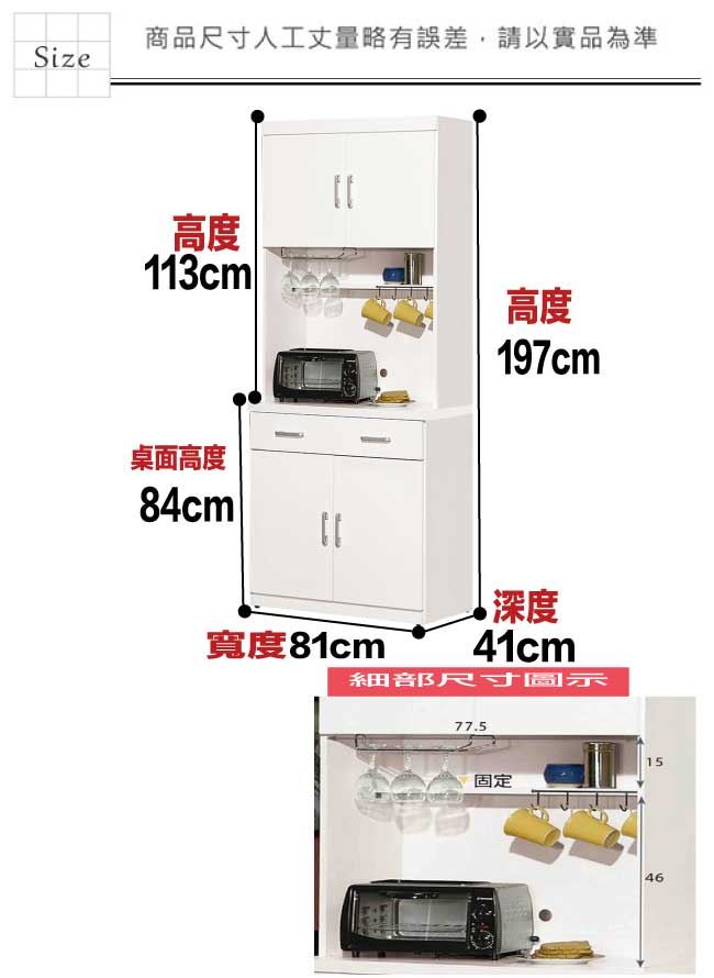 材質 | ◆產品名稱:【綠家居】巴克雅2.7尺四門二抽高餐櫃/收納櫃組合 尺寸:(寬)81x(深)41(高)197/公分 ◆材質: 材質:防蛀木心板+防潮耐磨腳座+五金滑軌結構 表面防潮亮面噴漆處理 |