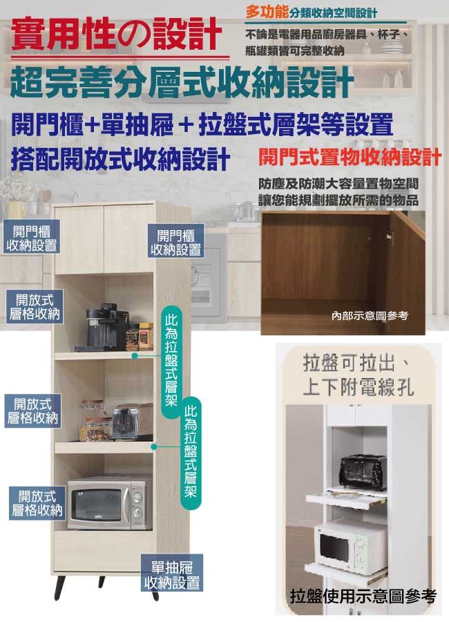 商 品 介 紹 | 【綠家居】麥比2尺二門拉盤單抽高餐櫃/電器櫃(二色可選) 二色可選+現代簡約風格+安心材質製造,使用放心+搭配居家更便利,整體採用防蛀木心板+防鏽黑漆五金腳座+五金滑軌結構+防夾手緩衝門片五金等材質搭配外層採用優莉坦耐磨全包式噴漆處理 ,採用開門櫃+拉盤式層架+單抽屜+開放層格等收納空間設計,全由專人配送到家,專業安心服務,替你省下更多時間! 【商品特色】 二色可選+現代簡約風格+安心材質製造,使用放心+搭配居家更便利 防蛀木心板+防鏽黑漆五金腳座+五金滑軌結構+防夾手緩衝門片五金等材質 採用開門櫃+拉盤式層架+單抽屜+開放層格等收納空間設計 此商品不需要DIY組立,此商品為組立後之成品 品質保證、專業設計、貼心服務 全由專人配送到家,專業安心服務,替您省下更多時間