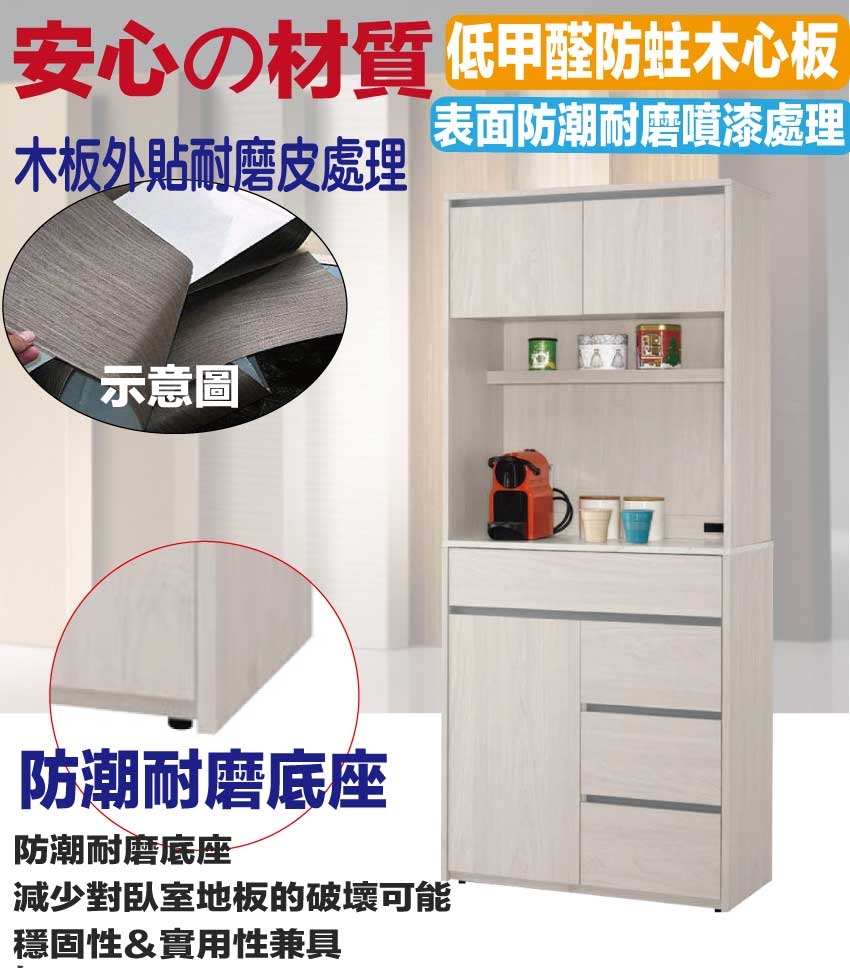 【綠家居】華爾雙色2.5尺三門四抽高餐櫃組合 木紋雙色系+安心材質製造,使用放心+搭配居家更便利,採用防蛀木心板+防潮耐磨底座+防夾手緩衝門片五金+仿石紋耐磨美耐皿桌面板+五金滑軌結構等安心材質製造 ,外層採用防潮耐磨噴漆處理搭配採用開門櫃+四抽屜+內&外開放層格+便利插座等收納空間設計,全由專人配送到家,專業安心服務,替你省下更多時間!
