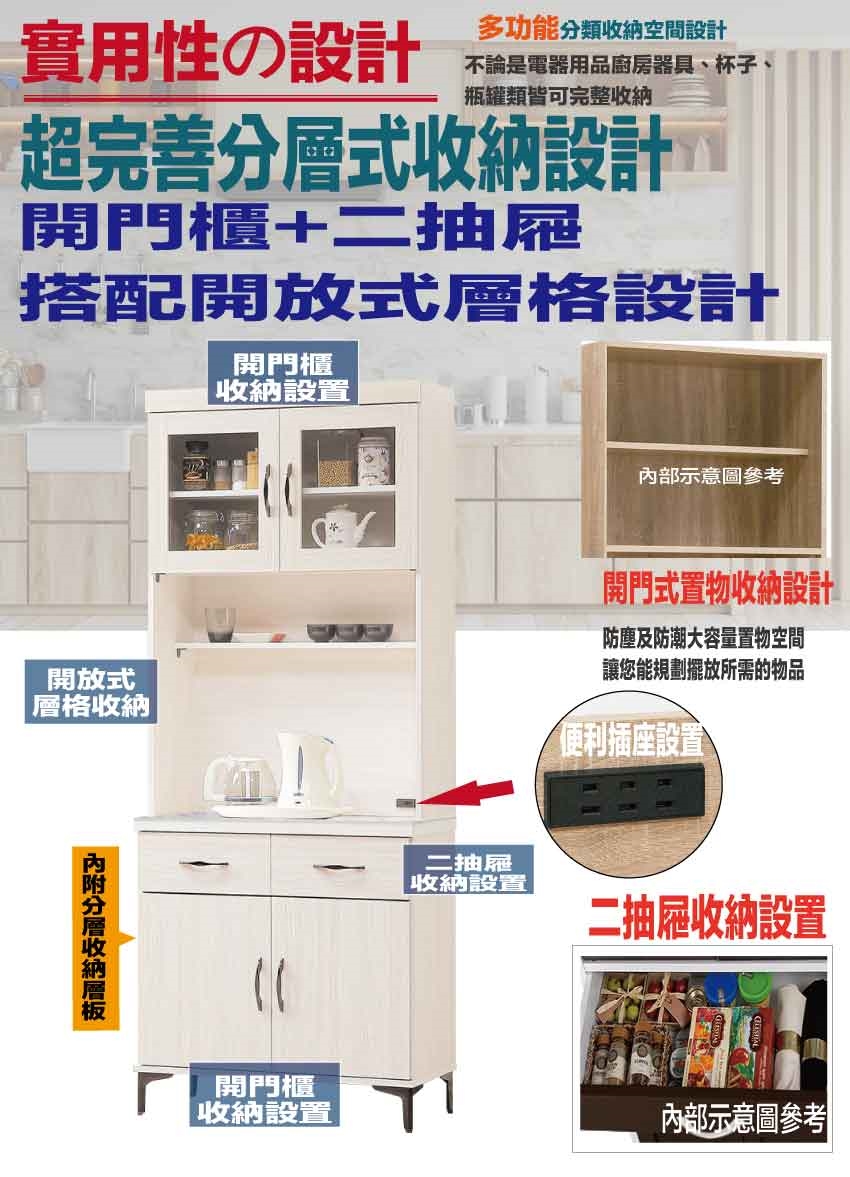 搭配採用開門櫃+二抽屜+內&外開放層格等收納空間設計