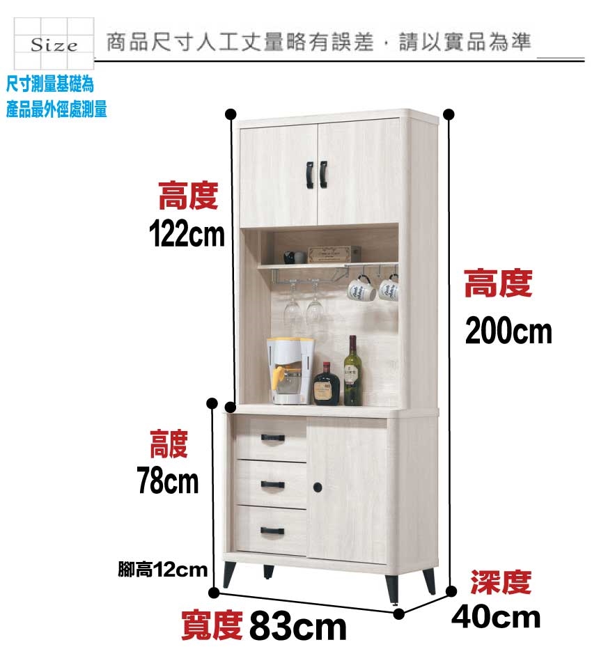 尺寸:(寬)83x(深)40x(高)200/公分 ◆材質: 材質:防蛀木心板+五金滑軌結構+防夾手緩衝門片五金+烤漆五金腳座 噴漆:防潮耐磨噴漆處理 ◎注意事項: 1.接單後,會有專員與您電聯確認送貨時間。 2.需以吊車吊運以當地吊車行情計,費用由消費者支付。 3.備註:本商品不含圖片上、家飾...等,情境圖之內容僅供參考。 4.請於配送人員到場時,檢查商品有無缺失,以免造成爭議。 5.允許的誤差尺寸範圍+-2%。 6.因拍攝燈光與電腦解析度瑩幕不同可能會造成實品與網頁上商品有些許色差,商品以收到實品為主。 ◎收貨與退貨: 1.實因特殊地型限制及(山區、濱海鄉、鎮、村、區)無法送貨時,本公司保有出貨與否之權利(下單後會由專人告知是否可配送)。 2.有電梯不收取費用! 無電梯樓層超過4樓以上(包含4樓)一樓層費用200元,現場支付給服務員。 3.超過鑑賞期,恕不接受退貨。 4.限非人為因素破壞毀損,才可退貨。 5.若退貨時,收件時間請與廠商協調,確保自己權益。 6.退貨時應保留贈品及附件完整(如有遺失部分,需酌收費用)。 ◎備註: .無回收服務。 .收貨與退貨:實因特殊地型限制及(山區、濱海鄉、鎮、村、區)無法送貨時,本公司保有出貨與否之權利(下單後會由專人告知是否可配送)。 .花蓮(縣市)、台東(縣市)、屏東(縣市場及其它縣市屬於山區、濱海鄉、鎮、村地區無配送服務,如您有需求,則需另外收取運費。(您可直接訂購,後續由廠商報價。) ※由於加價配送服務為一次消耗性商品,若有退換貨等情形加購之運費恕無法退還 ※運費報價皆為單趟計算。 ※使用加價配送地區,收貨時間會比一般地區再增加10個工作天。