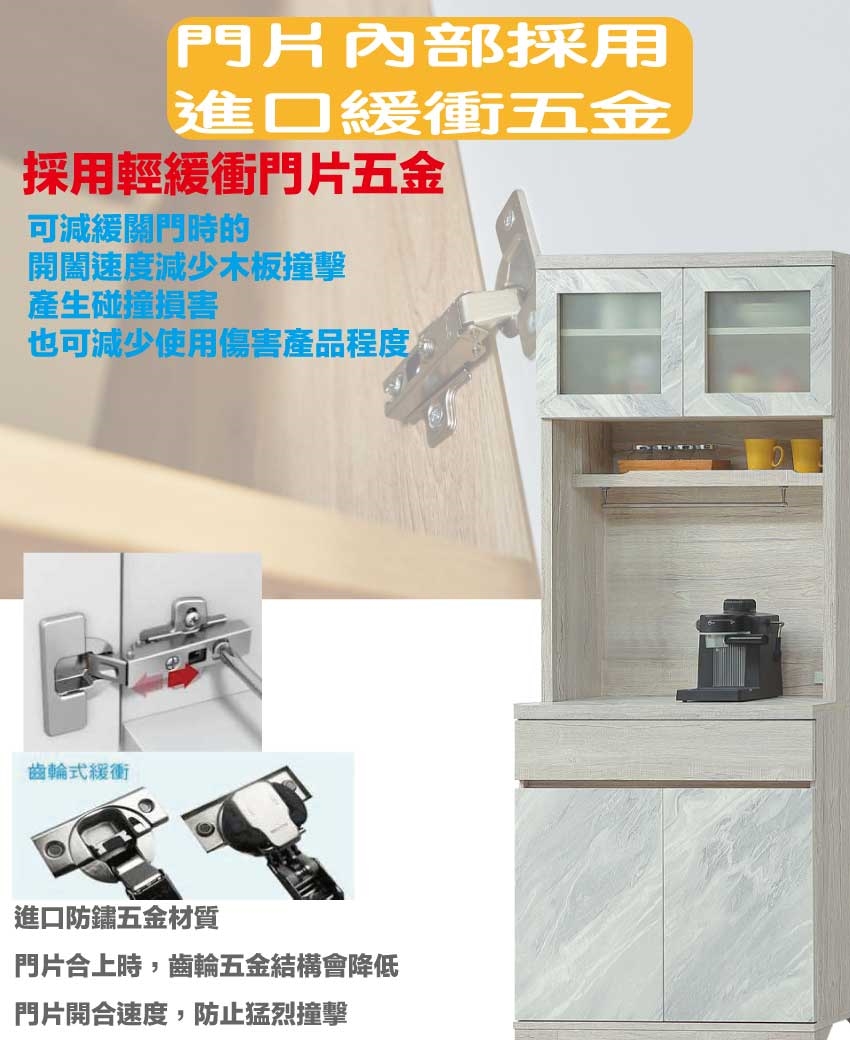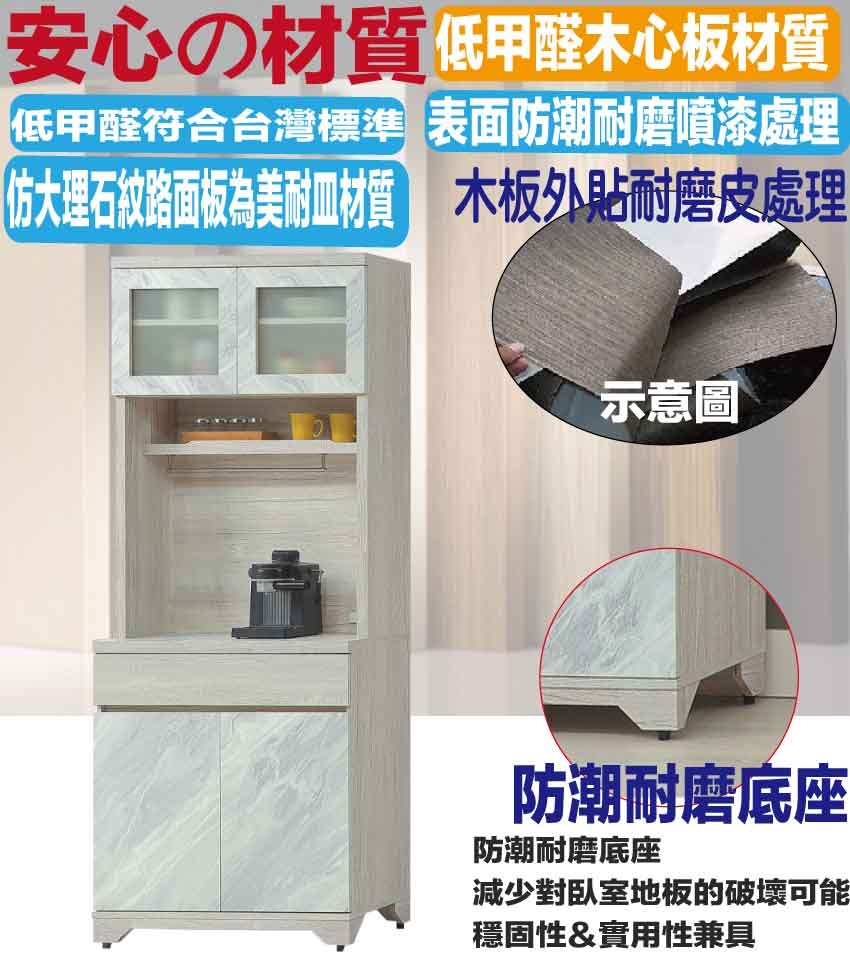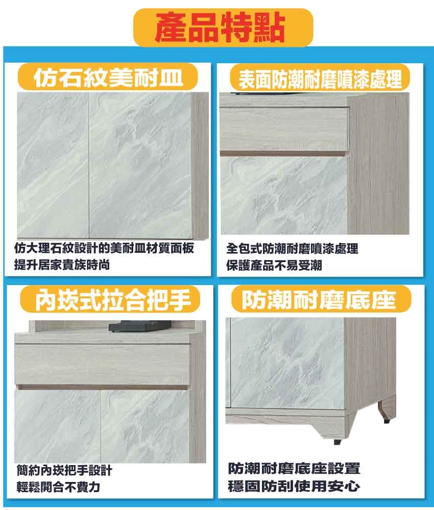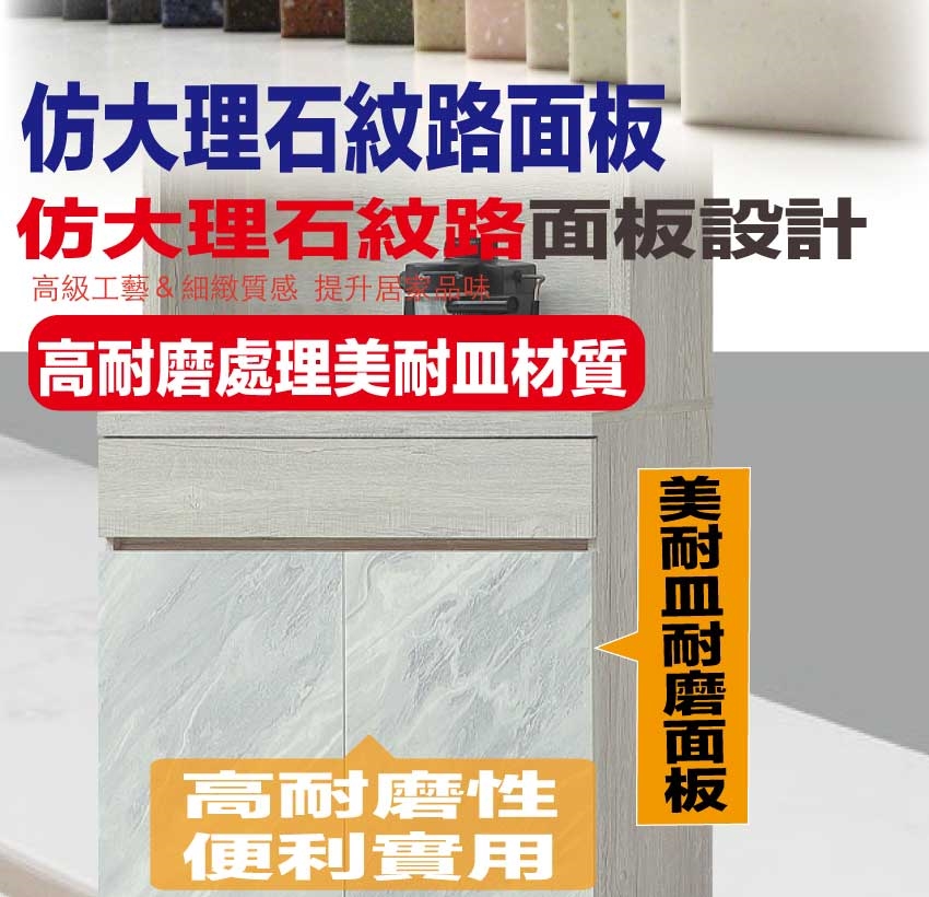 材質:防蛀木心板+防潮耐磨底座(可調高低水平)+仿大理石紋路耐磨美耐皿面板+防夾手緩衝門片五金-