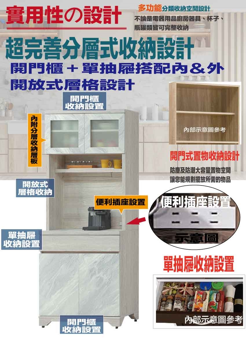 採用開門櫃+單抽屜+內&外開放層格等收納空間設計