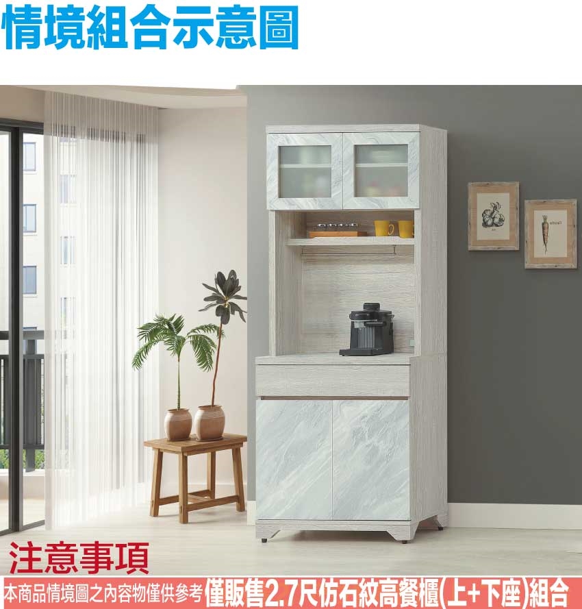 - ◆產品名稱:【綠家居】羅登2.7尺四門單抽高餐櫃組合(仿大理石紋路耐磨美耐皿面板)