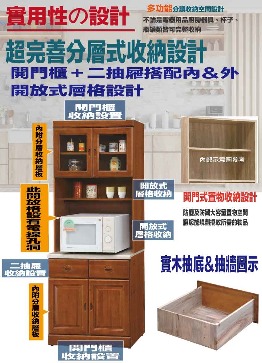 採用開門櫃+二抽屜+內&外開放層格等收納空間設計