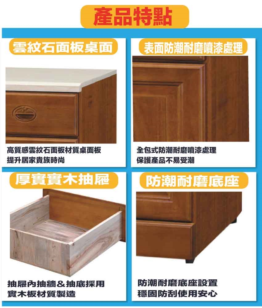 松木實木+防蛀木心板+防潮耐磨底座(可調高低水平)+2cm雲紋石面桌面板等安心材質製造