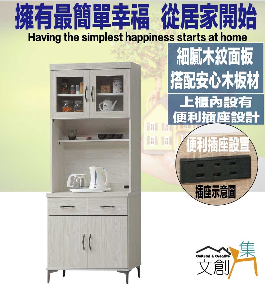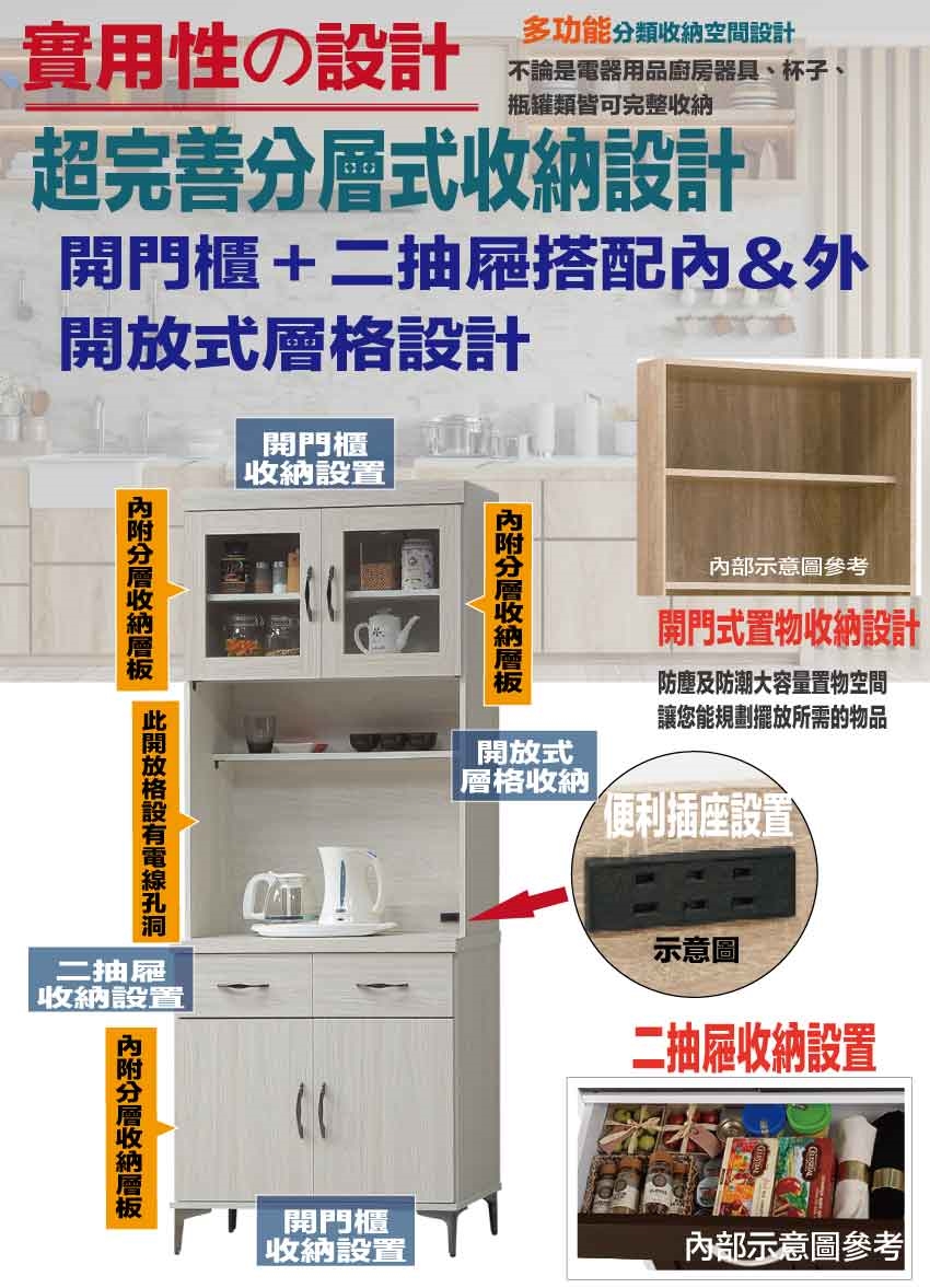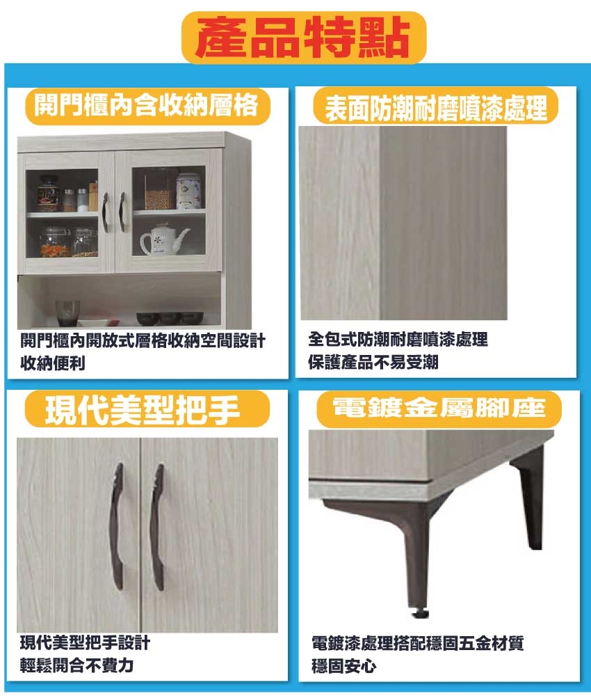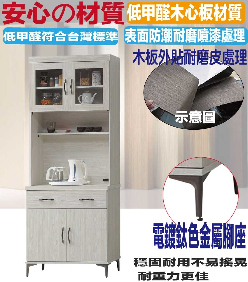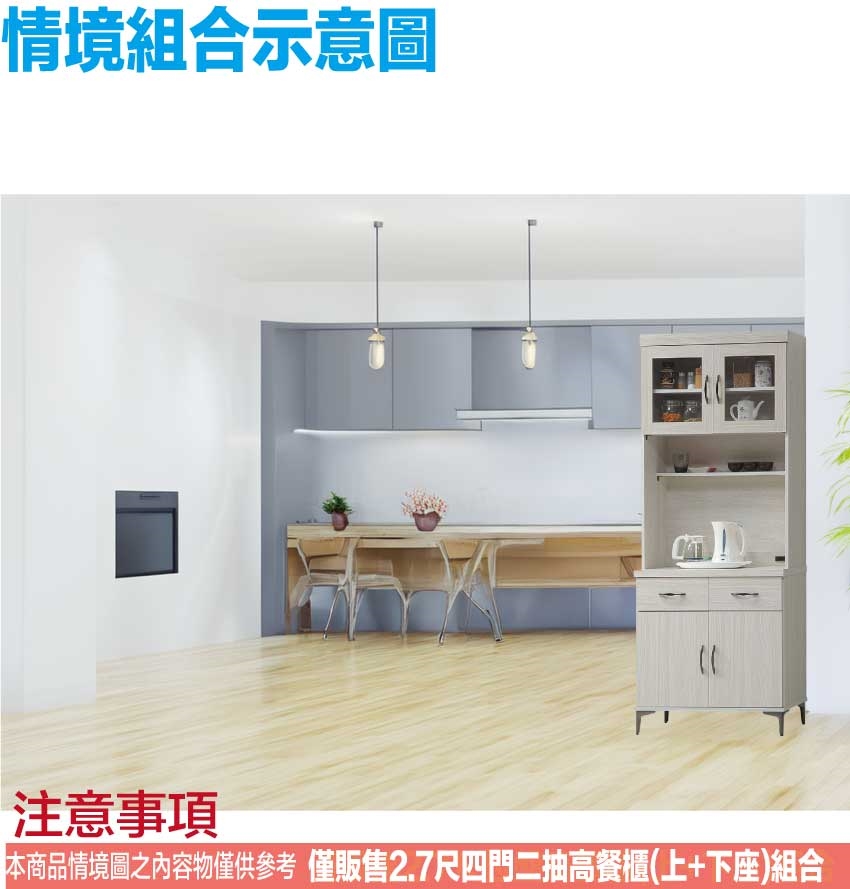 - ◆產品名稱:【綠家居】克亞2.7尺四門二抽高餐櫃組合(內含插座)