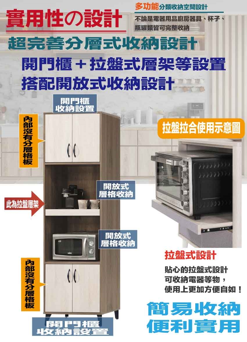 採用開門櫃+拉合式托盤層架+內&外開放層格等收納空間設計