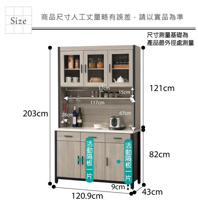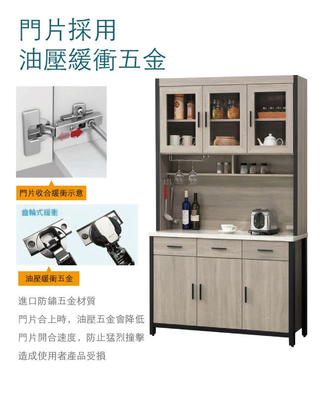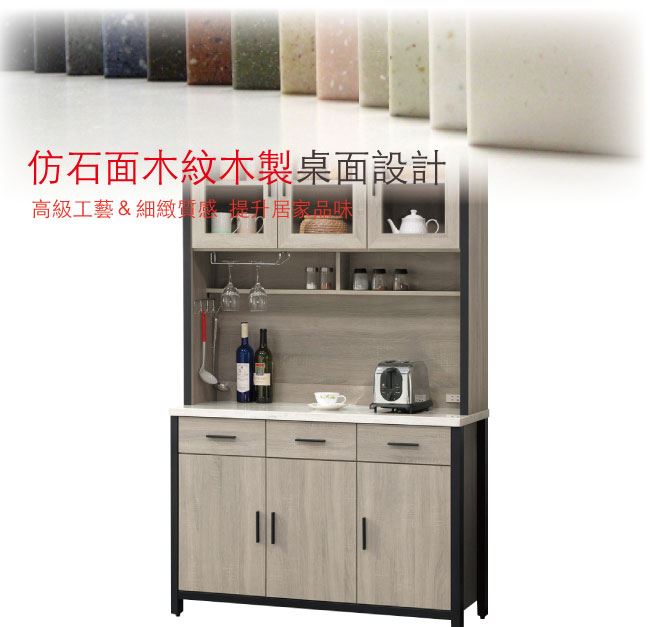 材質 | ◆產品名稱:【綠家居】 科托 時尚4尺六門三抽餐櫃/收納櫃組合 尺寸:(寬)120.9x(深)43x(高)203公分 ◆材質: 材質:防蛀木心板外貼皮+五金滑軌結構+黑色造型腳座+防夾手緩衝門片五金+仿雲紋石紋路木質桌面板 |