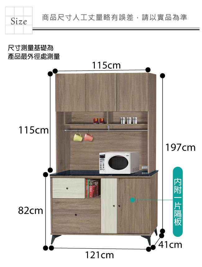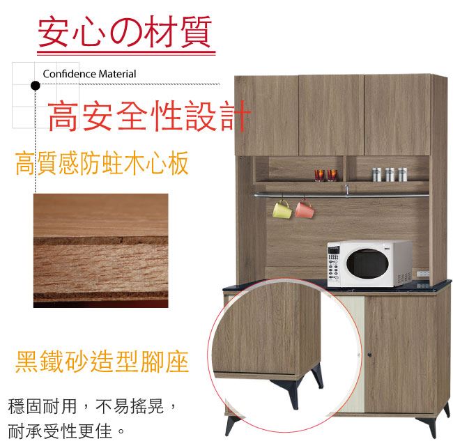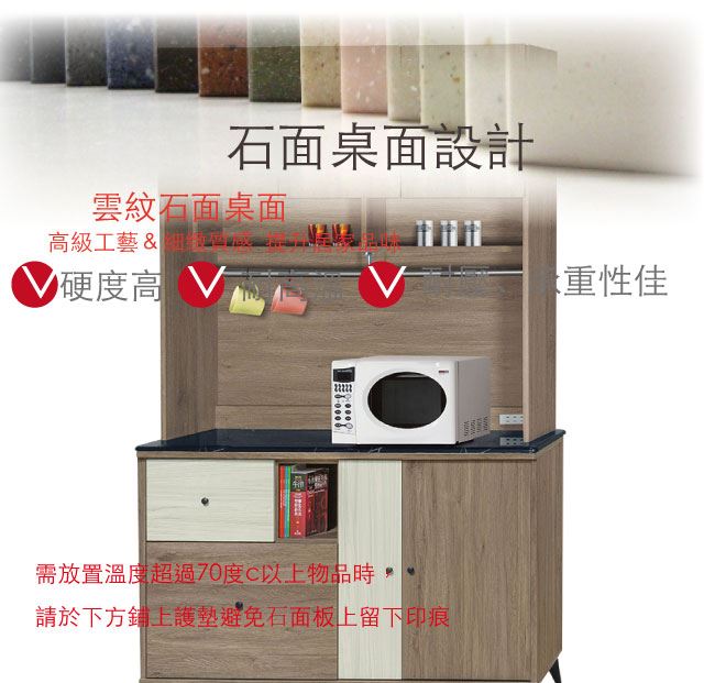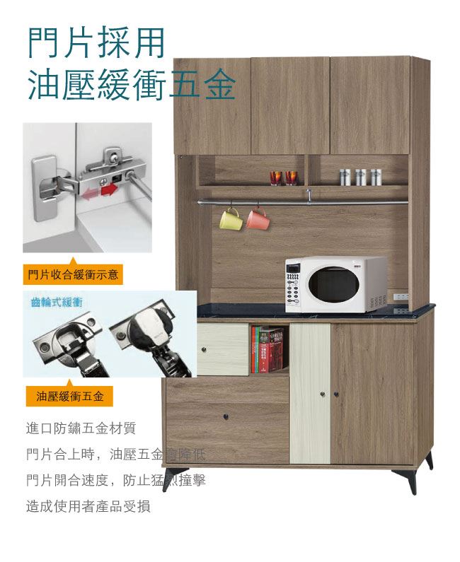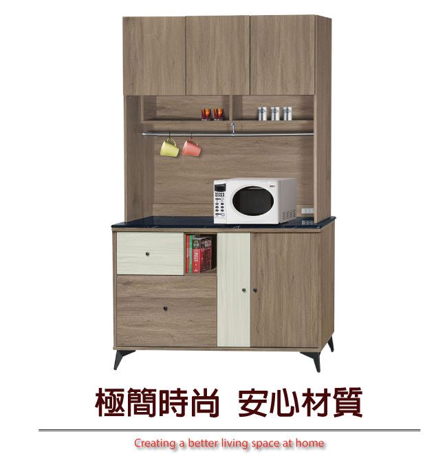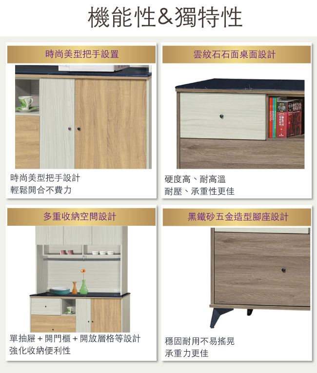 材質 | ◆產品名稱:【綠家居】甘托克 現代4尺雲紋石面餐櫃/收納櫃組合(二色可選+上+下座) 收納櫃尺寸:(寬)121x(深)41x(高)197/公分 ◆材質: 材質:防蛀木心板+黑鐵砂腳座+五金滑軌結構+防夾手緩衝門片五金+1.2cm雲紋石面 塗漆:優利坦三層全包式耐磨塗漆塗裝處理 |