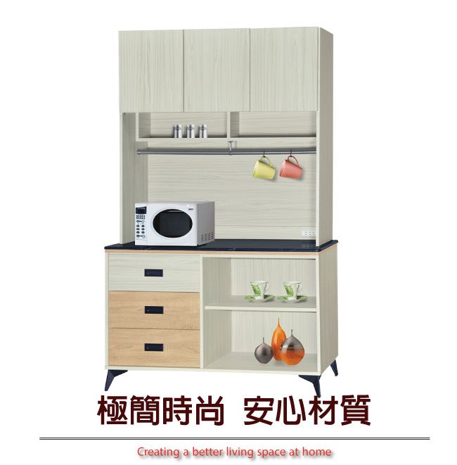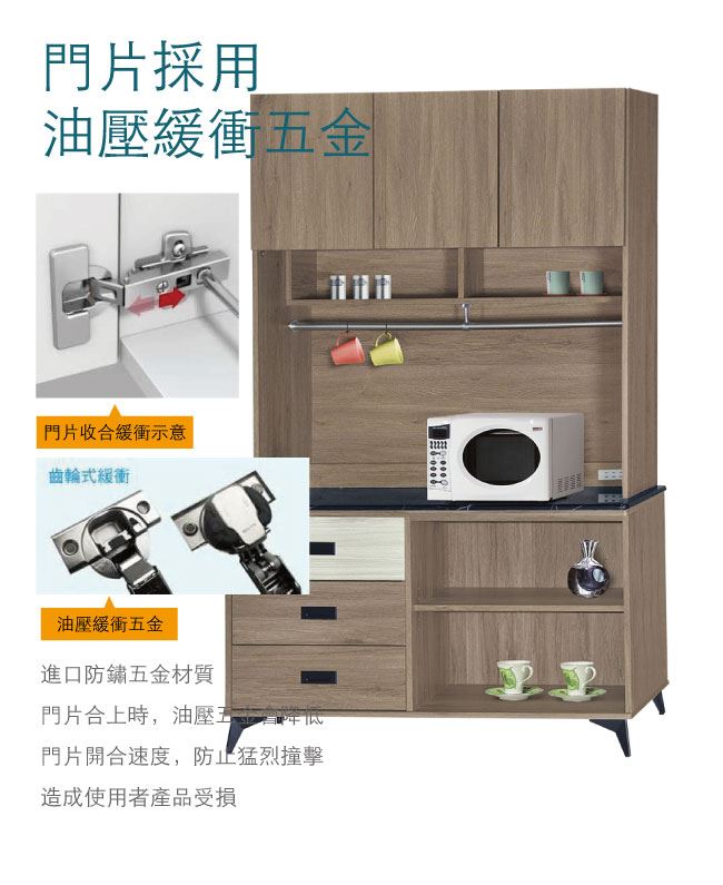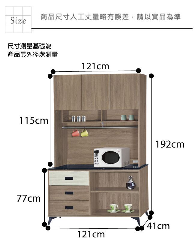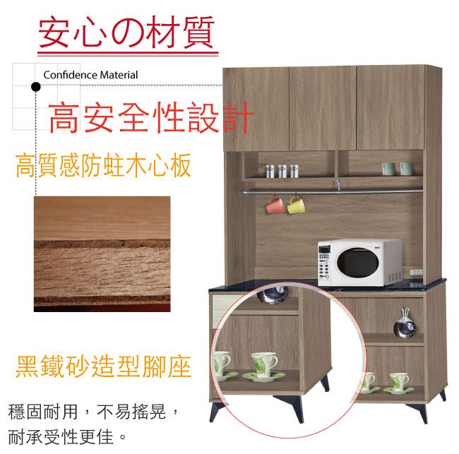 材質 | ◆產品名稱:【綠家居】托克 現代4尺雲紋石面餐櫃/收納櫃組合(二色可選+上+下座) 收納櫃尺寸:(寬)121x(深)41x(高)192/公分 ◆材質: 材質:防蛀木心板+黑鐵砂腳座+五金滑軌結構+防夾手緩衝門片五金+1.2cm雲紋石面 塗漆:優利坦三層全包式耐磨塗漆塗裝處理 |