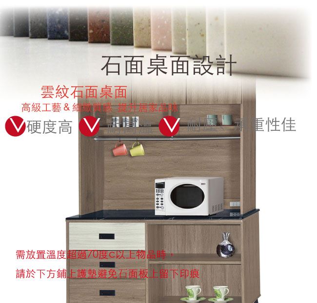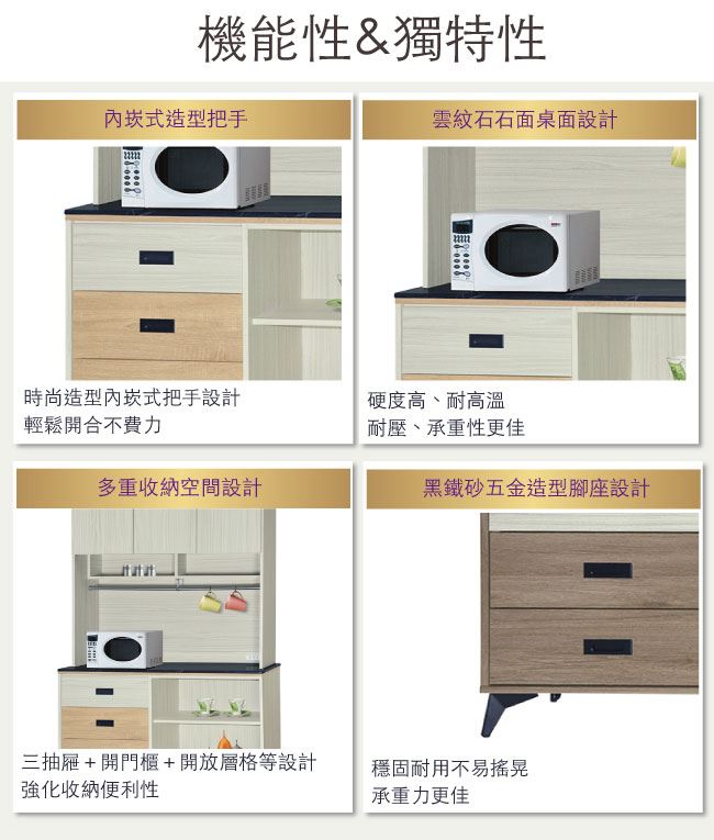 商品介紹 | 【綠家居】托克 現代4尺雲紋石面餐櫃/收納櫃組合(二色可選+上+下座) 二色可選+現代簡約風格+安心材質製造,整體採用防蛀木心板+黑鐵砂腳座+五金滑軌結構+防夾手緩衝門片五金+1.2cm雲紋石面等安心材質製造,外層採用優利坦三層全包式耐磨塗漆塗裝處理搭配採用三抽屜+開放式層格+開門櫃等收納設計,全由專人配送到家,專業安心服務,替你省下更多時間! 【商品特色】 二色可選+現代簡約風格+安心材質製造,使用放心+搭配居家更便利 採用防蛀木心板+黑鐵砂腳座+五金滑軌結構+防夾手緩衝門片五金+1.2cm雲紋石面等安心材質製造 採用三抽屜+開放式層格+開門櫃等收納設計 此商品不需要DIY組立,此商品為組立後之成品 品質保證、專業設計、貼心服務 全由專人配送到家,專業安心服務,替您省下更多時間 |
